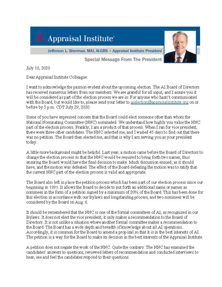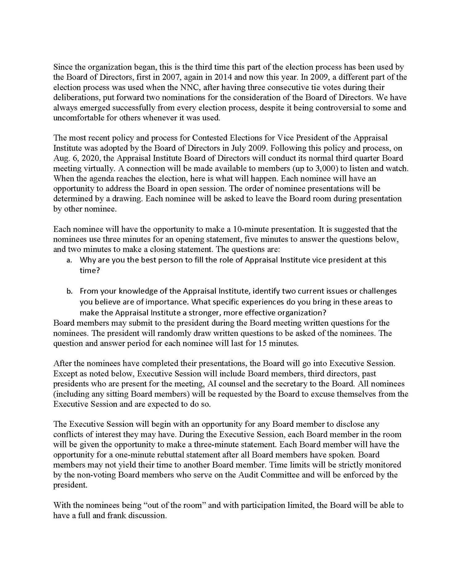 I now offer to you, and to each Board member, this is not about style or personality; it must be about the best interests of the Appraisal Institute. I have supreme confidence that the trust you have placed in your elected representatives will be confirmed, regardless of the person chosen.