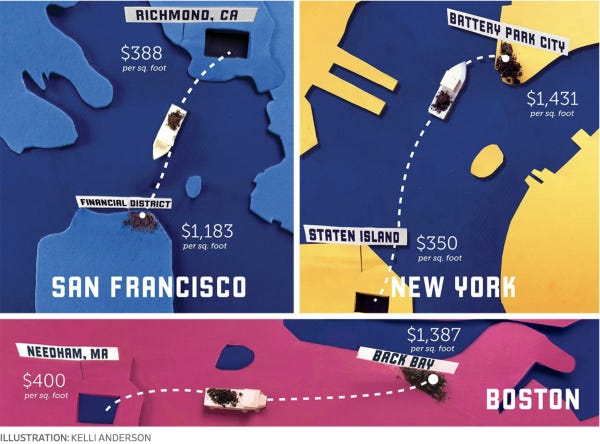This formed the premise of a fun Wall Street Journal piece powered by NeighborhoodX (I’m an advisor) about the creation of new land for housing and how this process creates value. The article talks about how Battery Park City was created by sand dredged and moved from Staten Island (and it was also more famously taken from the excavation for the World Trade Center and other construction projects).