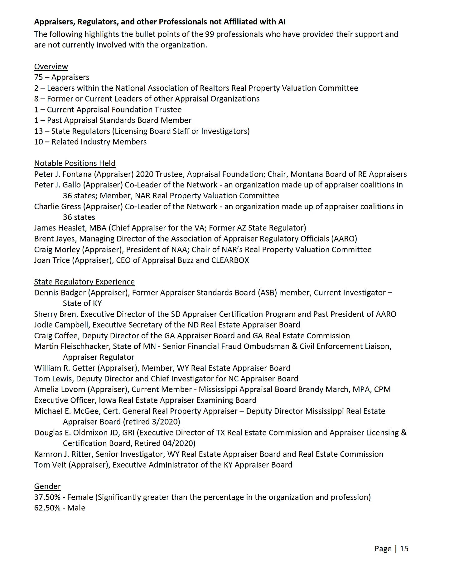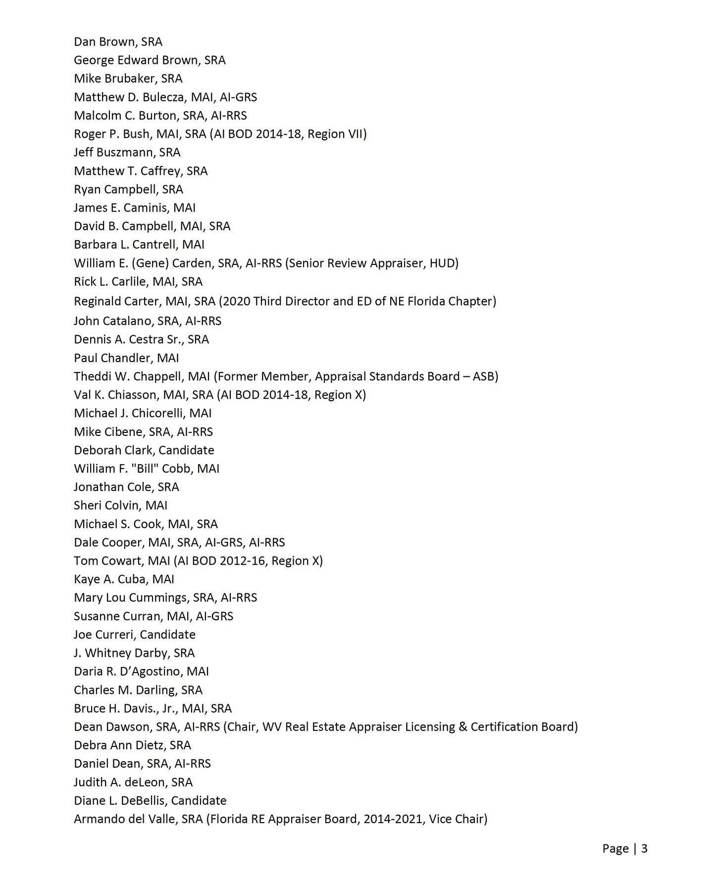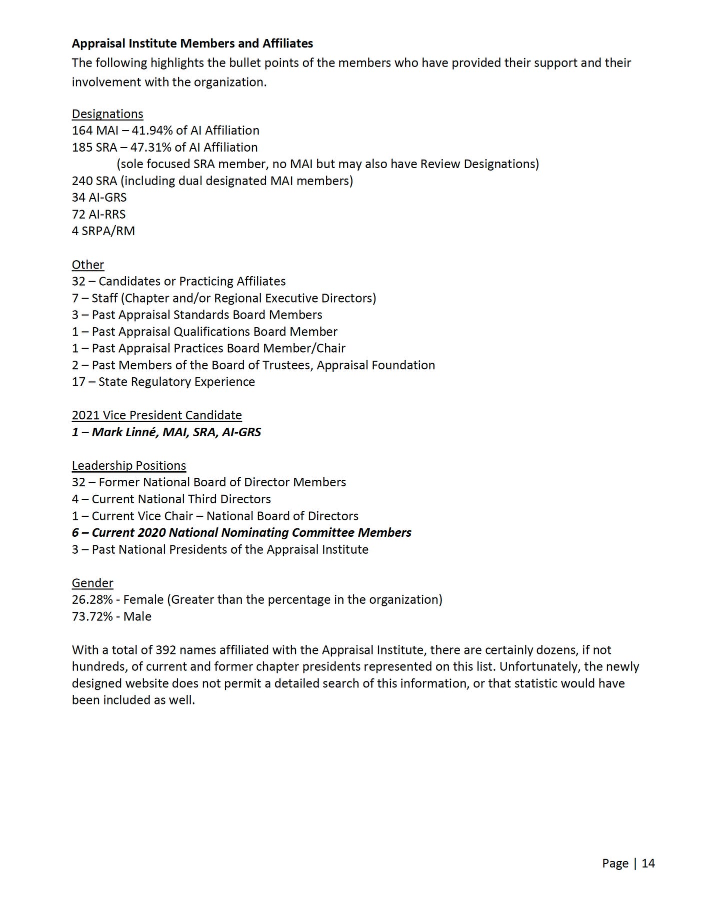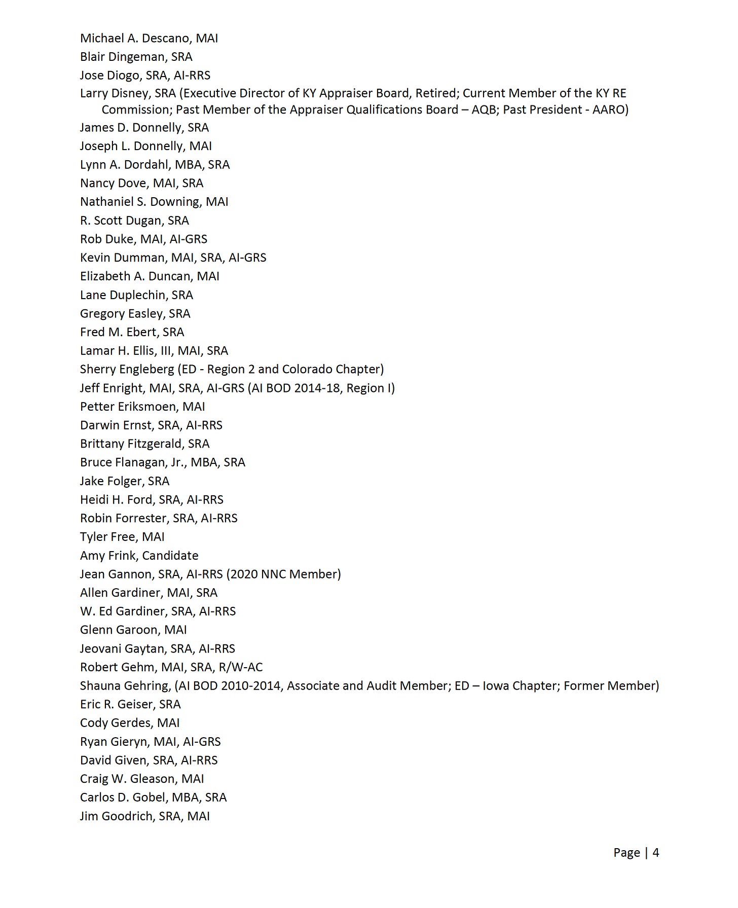 AI CEO Jim Amorin ($450K/year) disagreed and used the petition process to make Michael Tankersley the Second Vice President and doesn’t have to give a reason. Mark Linne stepped away from being considered. In other words, the membership nomination process that is supposed to be separate from the executives running the organization is wildly compromised. I am not critical of Michael Tankersley as an appraiser because I know nothing other than his credentials, but I am certainly disappointed that someone with outstanding professional credentials would be willing to circumvent the membership-driven process for personal advancement.