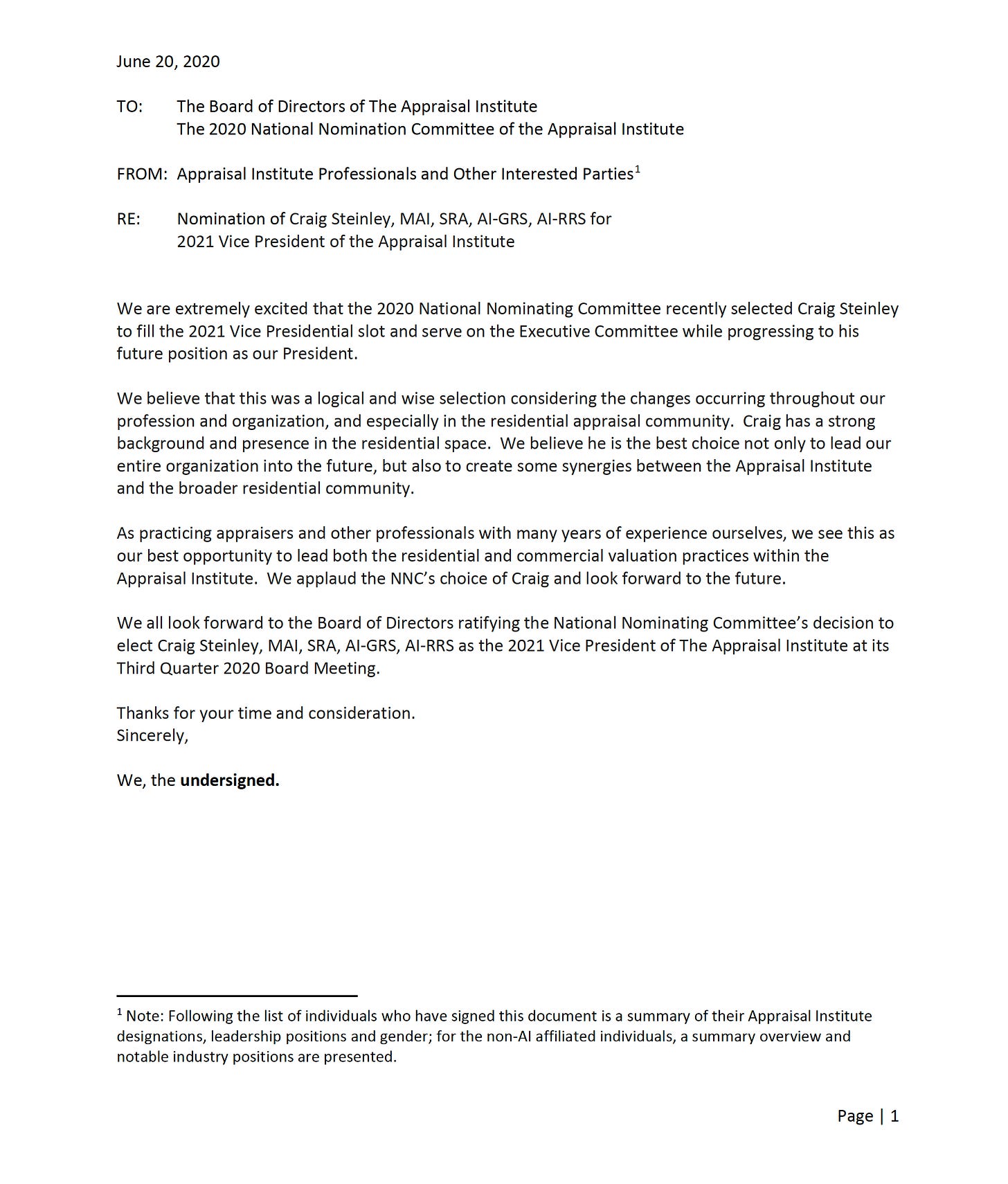 A well-regarded and nationally-known appraiser and Appraisal Institute member, Craig Steinley, won the backing of the national nominating committee, and his name was submitted publicly because confirmation is essentially a rubber stamp. Craig was thought to be the best choice this year by the national nominating committee. The confirmation is supposed to take place in the first week of August (more details later on).