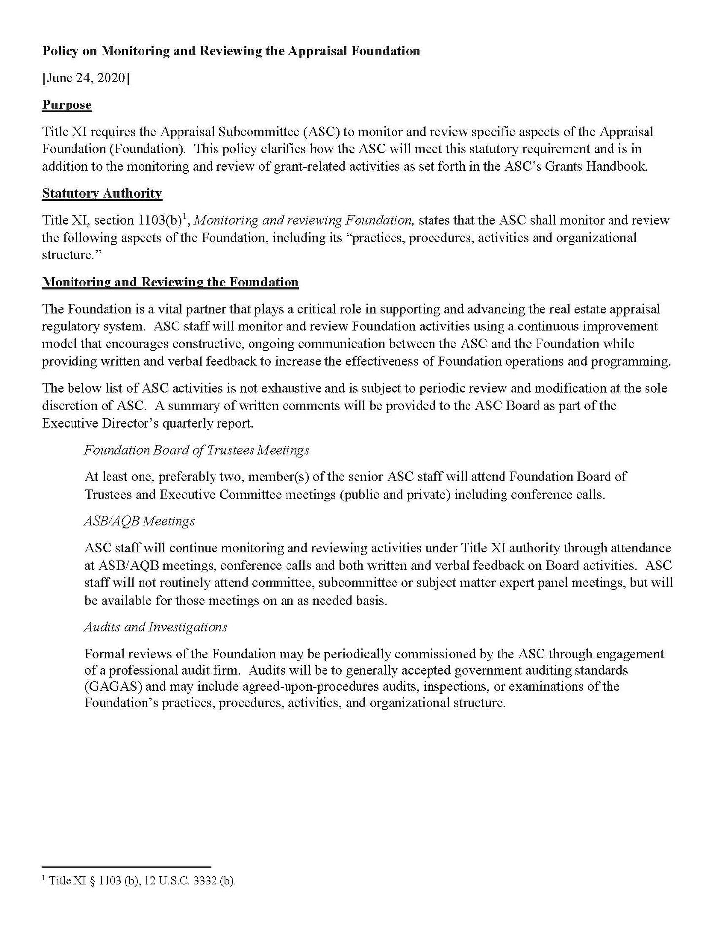 (b) Monitoring and reviewing Foundation. The Appraisal Subcommittee shall monitor and