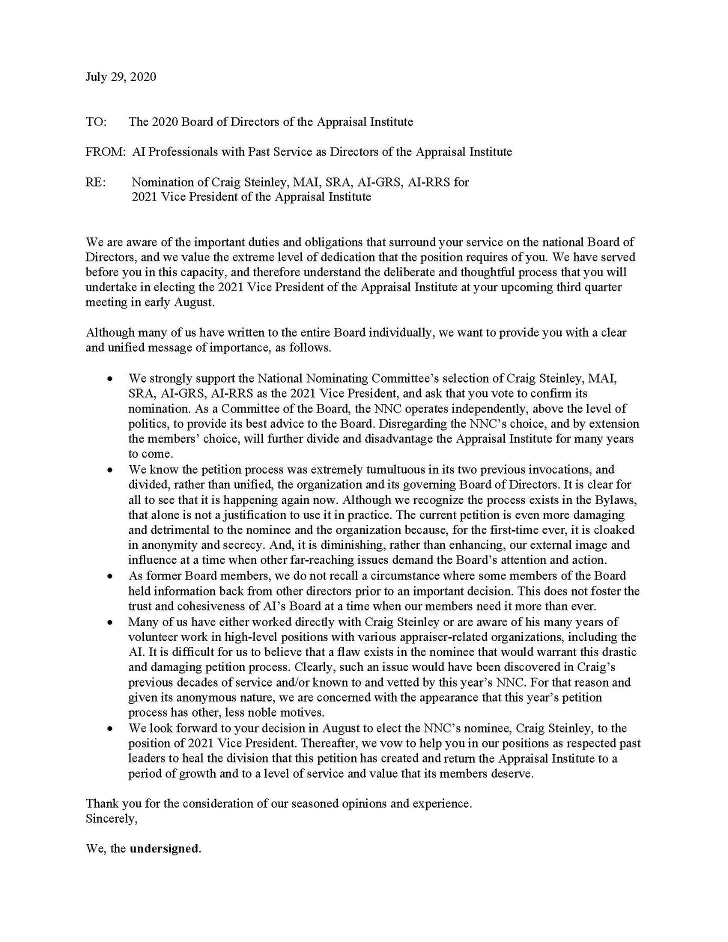 This July 29, 2020 letter was written from AI Professionals with Past Service as Directors of the Appraisal Institute to express their support for Craig Steinley, the only vetted and selected candidate by the nominating committee. They give many reasons for their support of Craig, but this one stood out to me:
