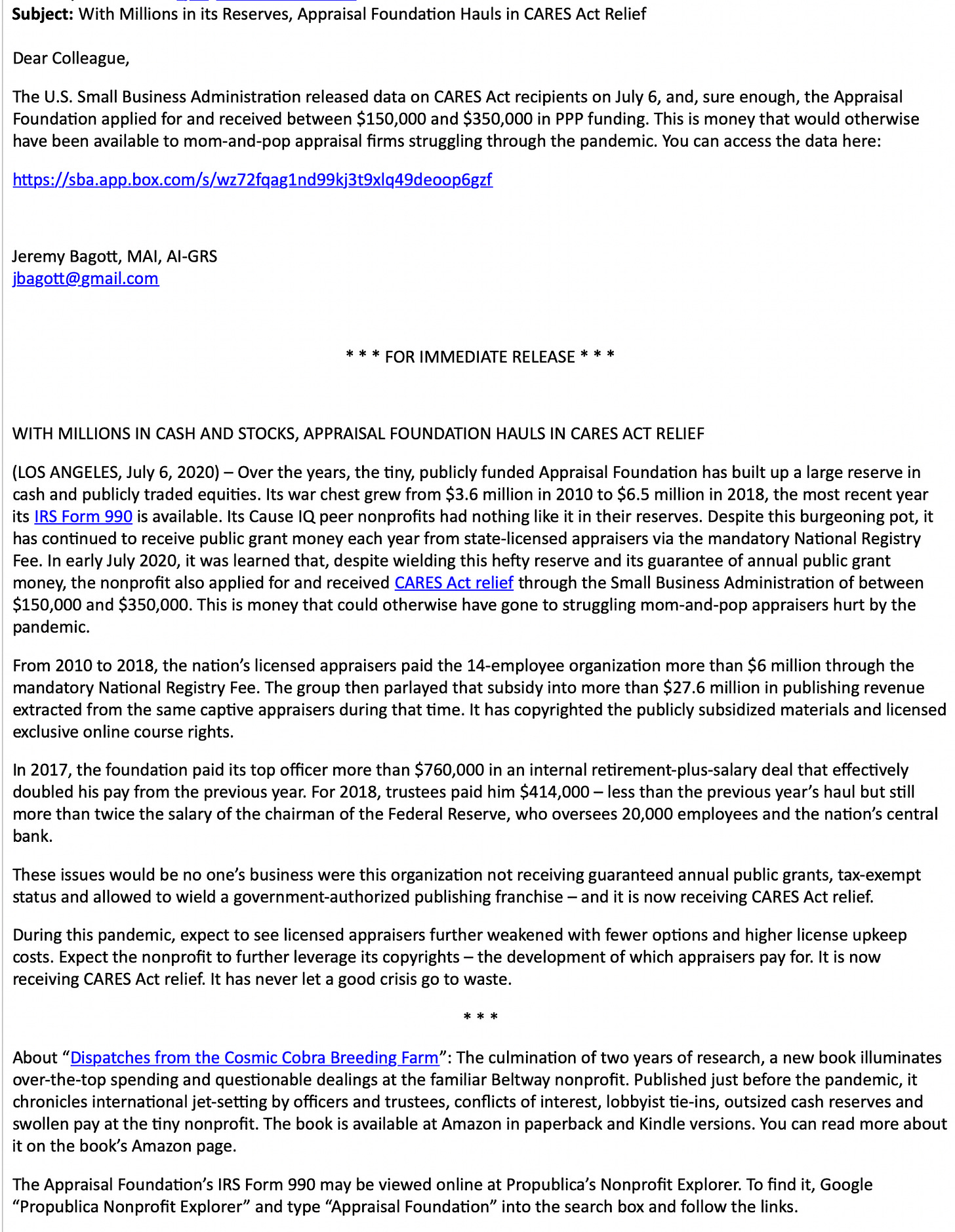 There was an email passed around by Jeremy Bagott recently about the TAF’s collection of PPP funds that caught my attention. Bagott, the author of “Dispatches from the Cosmic Cobra Breeding Farm” that came out earlier this year was essentially a takedown of the Appraisal Foundation (TAF) via “incorporation by reference.” Initially, I was intrigued when the book came out but the author came across too strong on Dave Bunton’s compensation to which TAF responded and it took a lot of the wind out of the sails of the book marketing process.