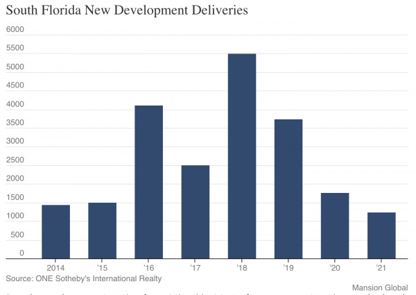 Mansion Global does a good job showing the future incoming new development supply for Manhattan (using our data) and Miami.