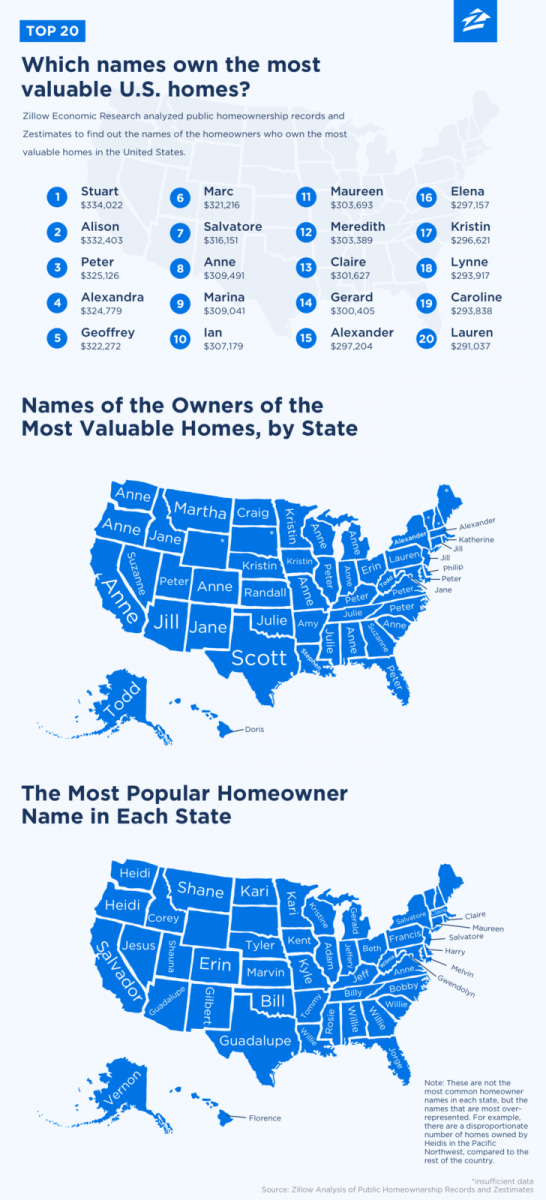 Oh, by the way, your name correlates with how valuable your home is…according to Zillow. I’m not sure why they continue to push out these misleading “fun facts?” They have such strong economic analytic firepower from good people yet insist on stat junk. I love to have fun with numbers as much as the next person, but it is important to convey the meaningless nature of it as a disclaimer so consumers don’t just run with it.