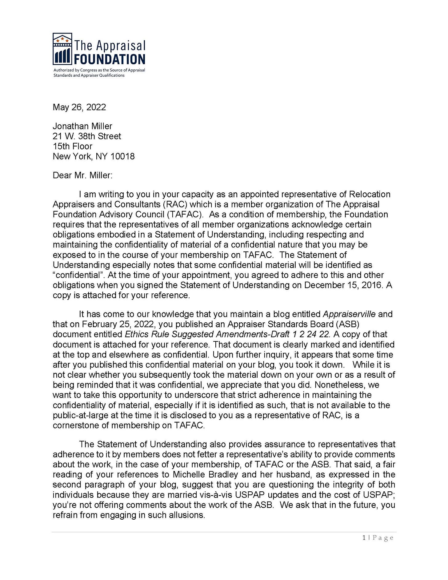 I received your letter today, and I am disappointed that TAF continues to hide behind its bureaucratic largess. Given my history, I am surprised you signed such a letter, but I also want to thank you for providing more tangible evidence of how The Appraisal Foundation operates. Unfortunately, you never attached the “documents” you cited which are the “Ethics Rule Suggested Amendments-Draft 1 2 24 22” as well as “Statement of Understanding on December 15, 2016 – I’m sure it was just an oversight. I’d appreciate your follow-up in sending the document for my records at your earliest convenience.