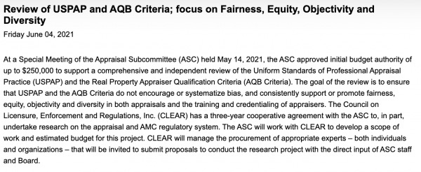 The goal of the review is to ensure that USPAP and the AQB Criteria do not encourage or systematize bias, and consistently support or promote fairness, equity, objectivity and diversity in both appraisals and the training and credentialing of appraisers.