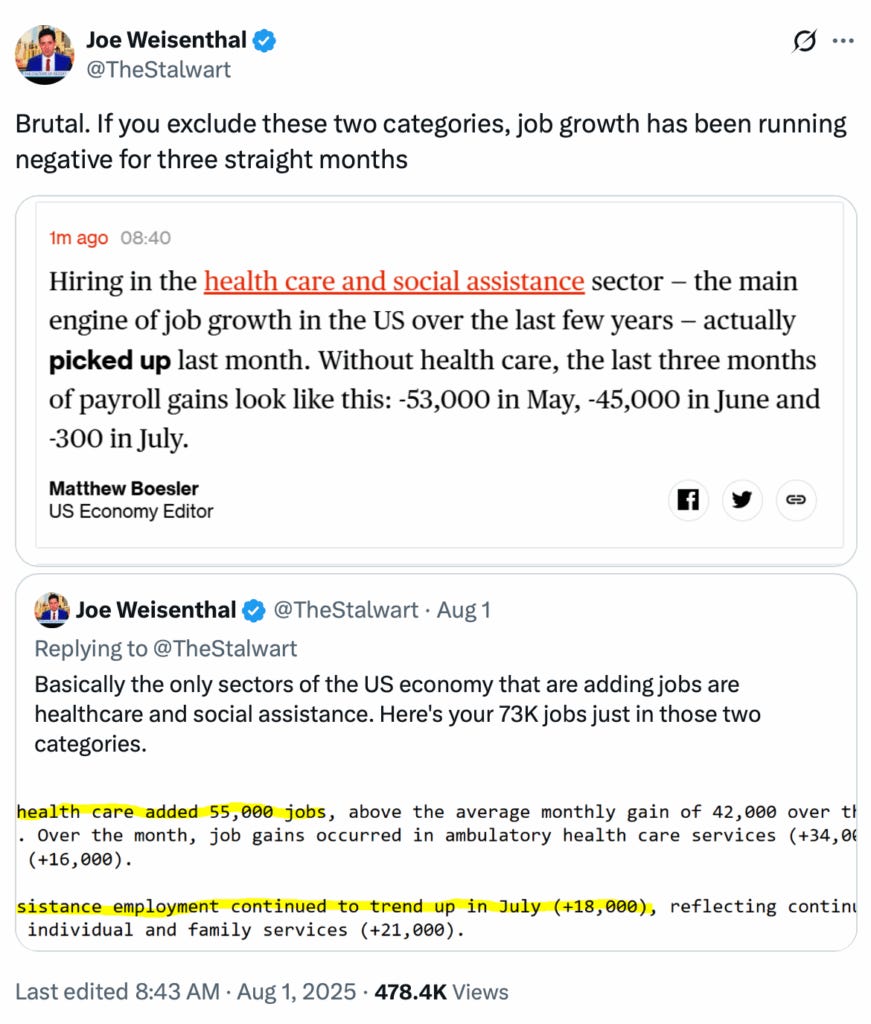 But how can economic data be trusted going forward if experts are quickly removed when the president doesn’t like the results? Given the downward job revisions of May and June, as noted in the chart above, I wouldn’t be surprised if July is revised downward if that’s even possible in the new world. It is important to note that tariffs were implemented in early April, which pushed a robust economy off the rails by May.