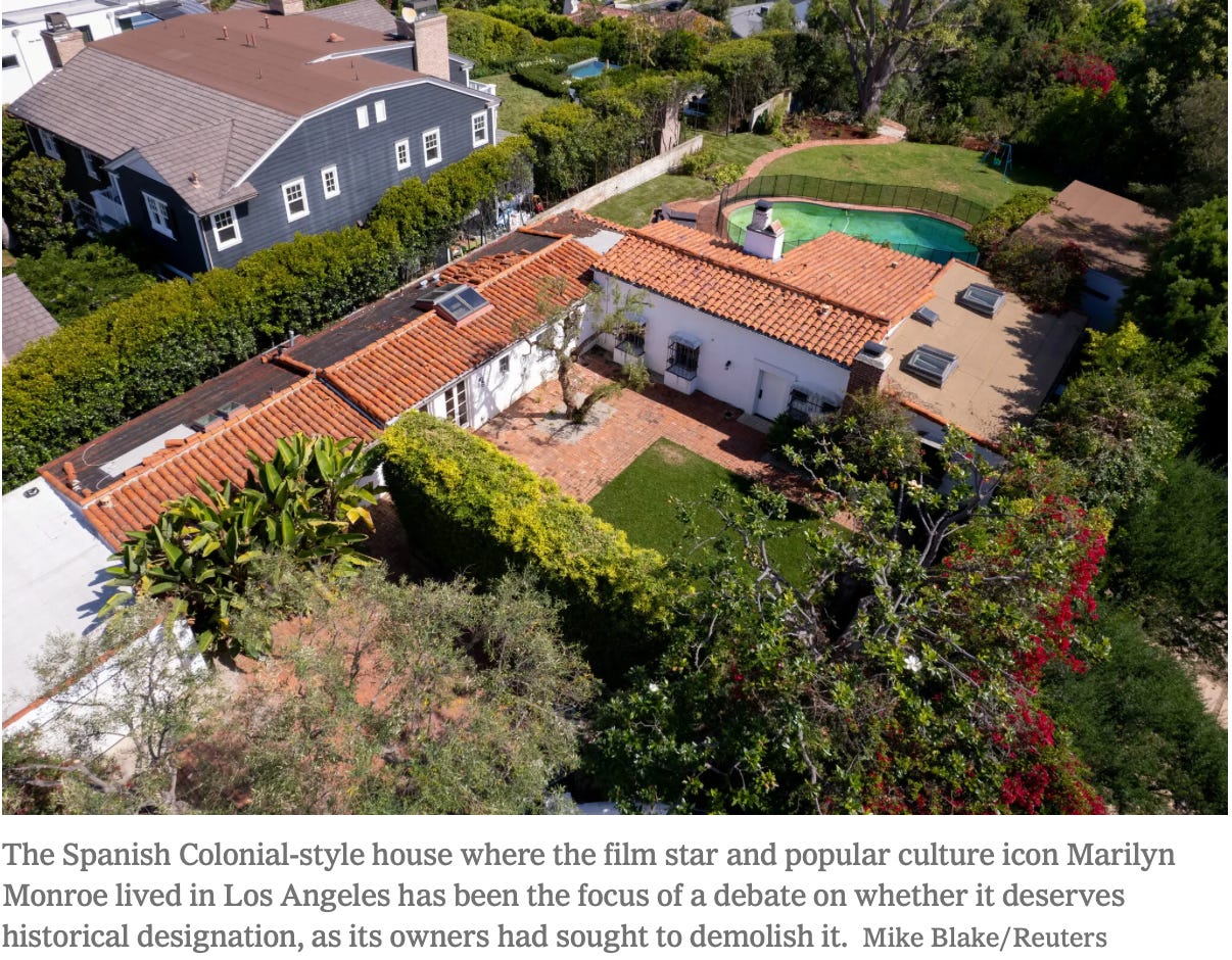 Marilyn Monroe’s home where she lived and died came very close to being demolished. After a charged effort by community groups to stop the owners from tearing it down, the LA City Council voted 12-0 to preserve the home by adding it to the property roster for its historical significance. To some, the loss of control of a property by its owners is probably an affront. But in landmarking, the greater good tends to be the goal, much like zoning laws.