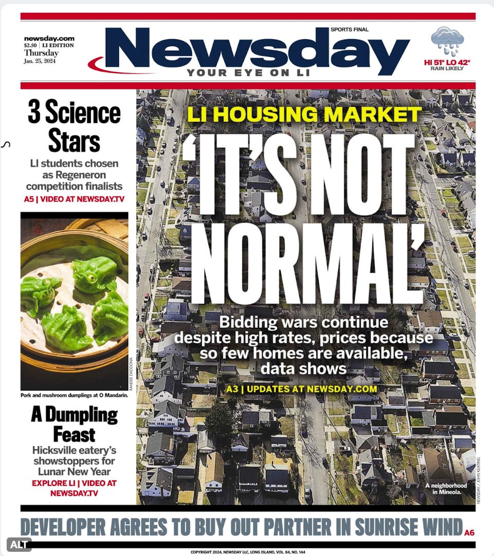 Newsday editors pulled my quote from an explainer piece on the Long Island housing market and our research to place it on the cover of Long Island’s largest newspaper. It’s the tenth time (I’m a list-keeper) our Long Island quarterly market report for Douglas Elliman has been on the cover, and I’m so appreciative. Jonathan LaMantia’s cover story: Long Island home prices hover near highs, as agents wonder when more sellers will emerge.