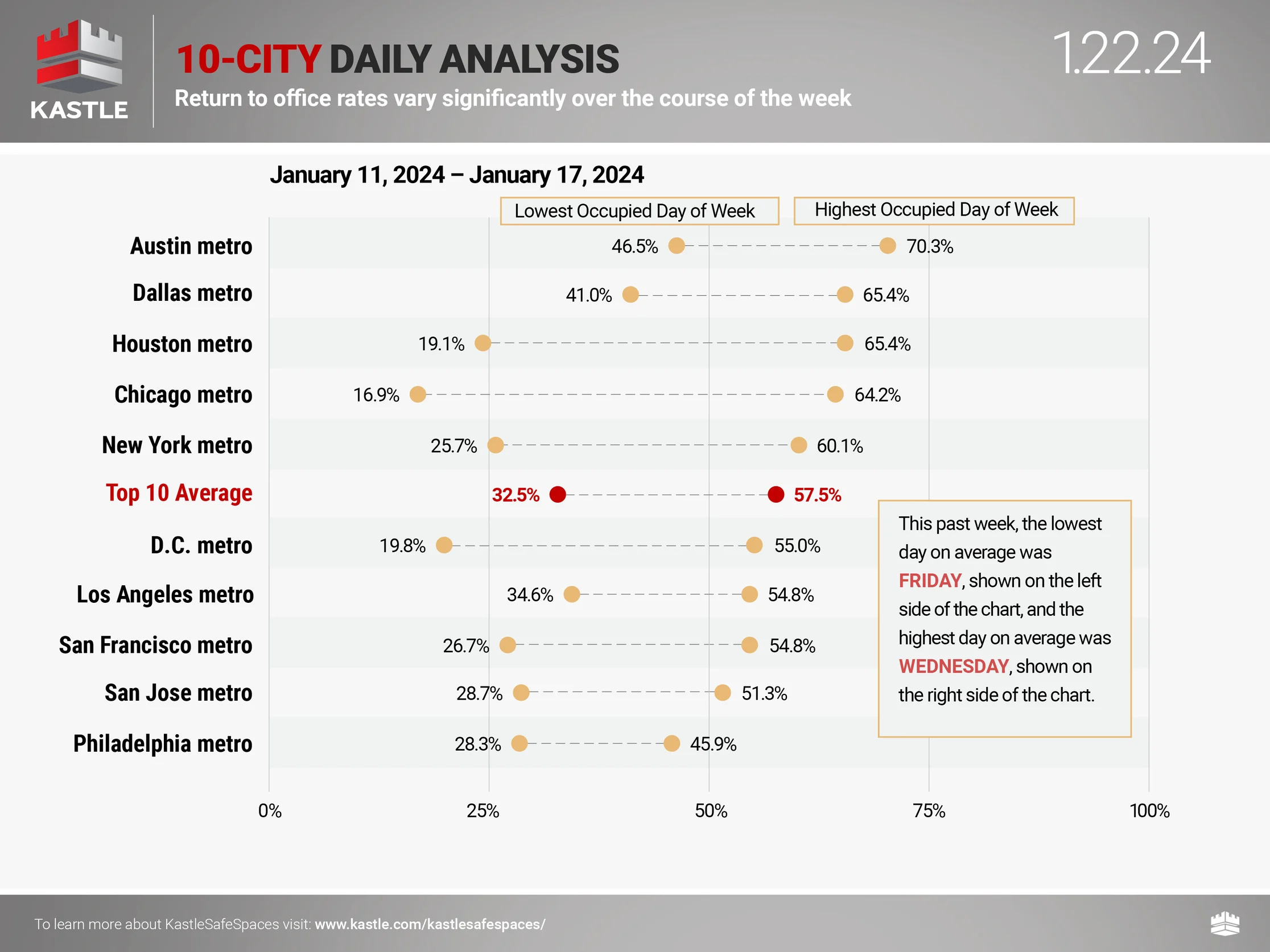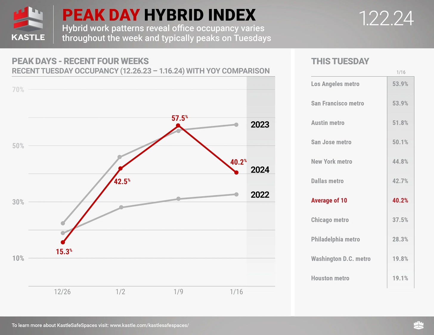 Remember that Kastle charts are overstating occupancy* because their pre-pandemic occupancy benchmark was 100%, which is incorrect (*measures card swipe activity as a proxy for occupancy). Still, they’ve become the standard benchmark for occupancy rates.