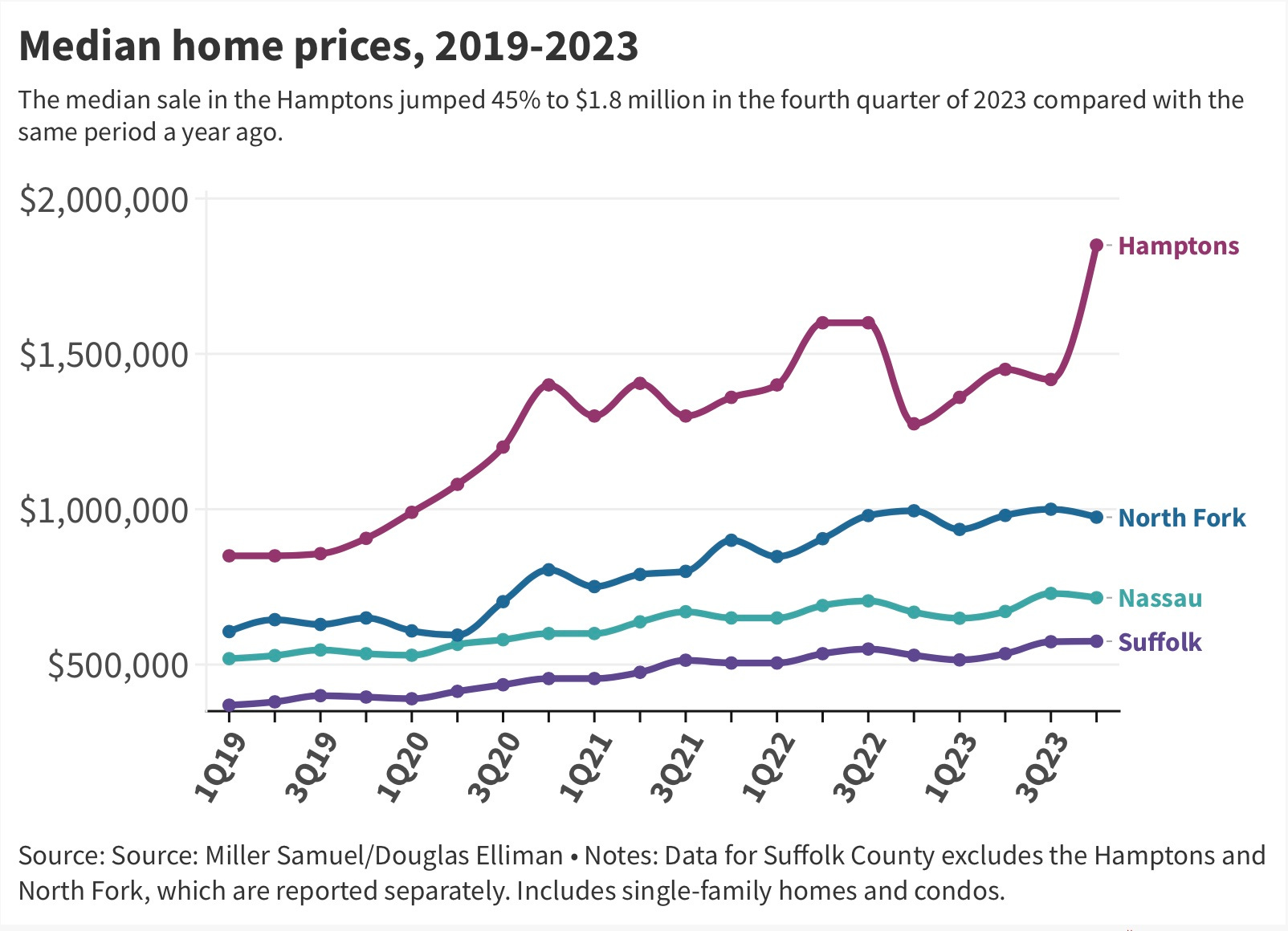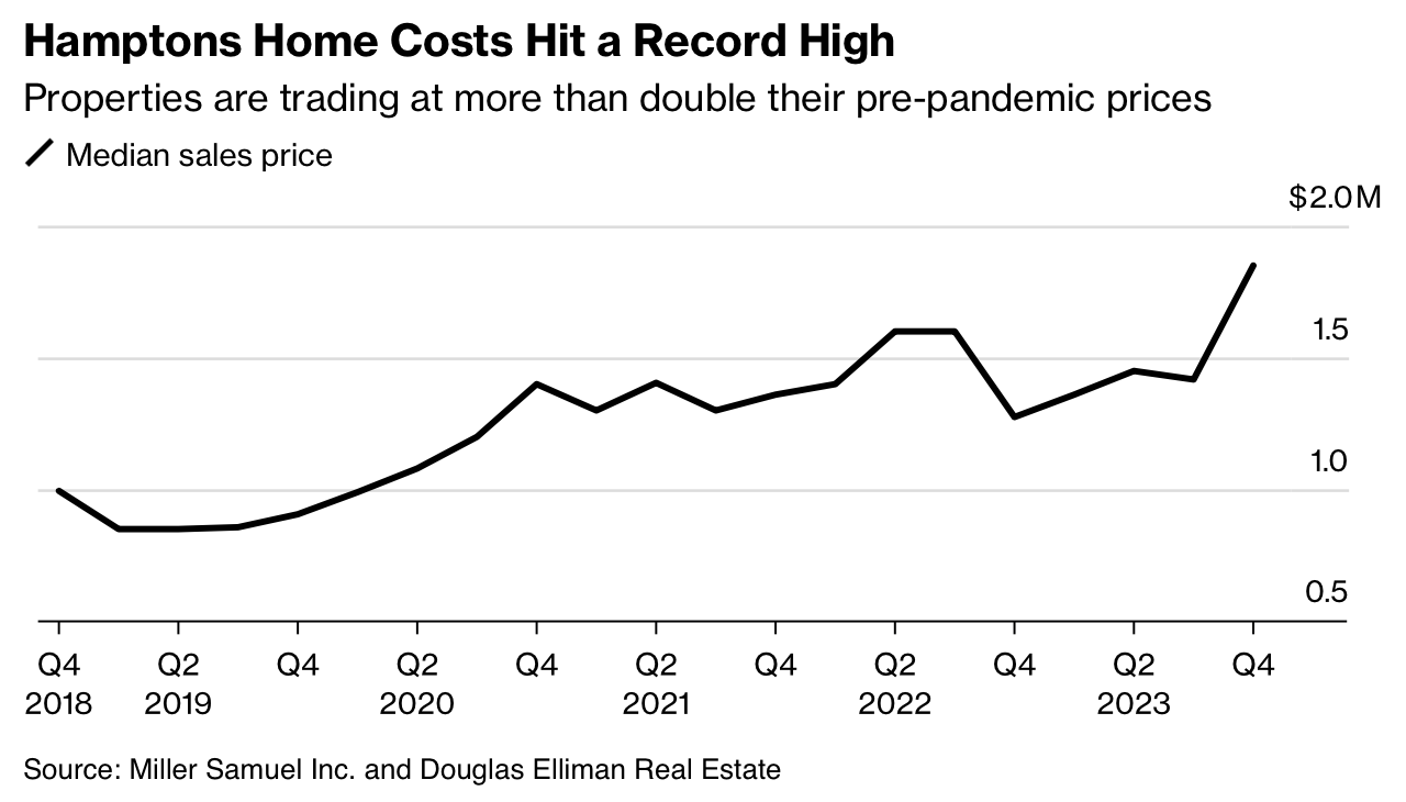 Bloomberg covered the report Hamptons Home Prices Jump to a Record High with an always cool chart.