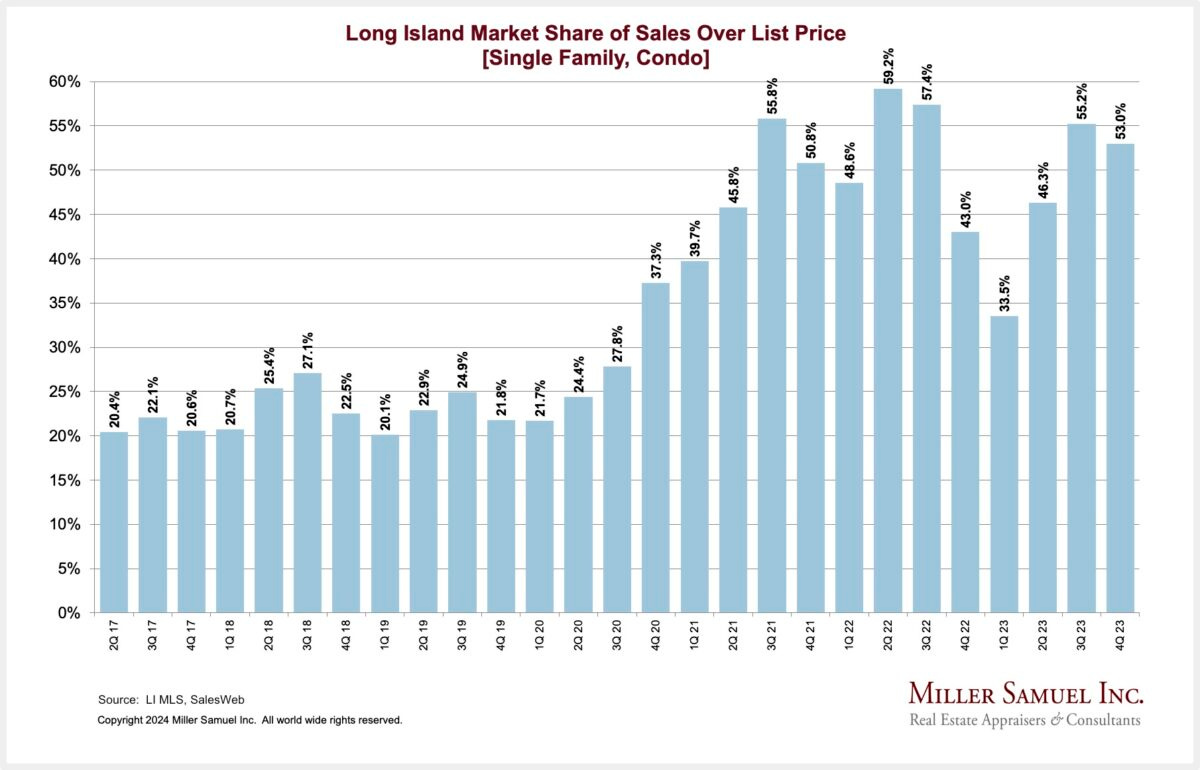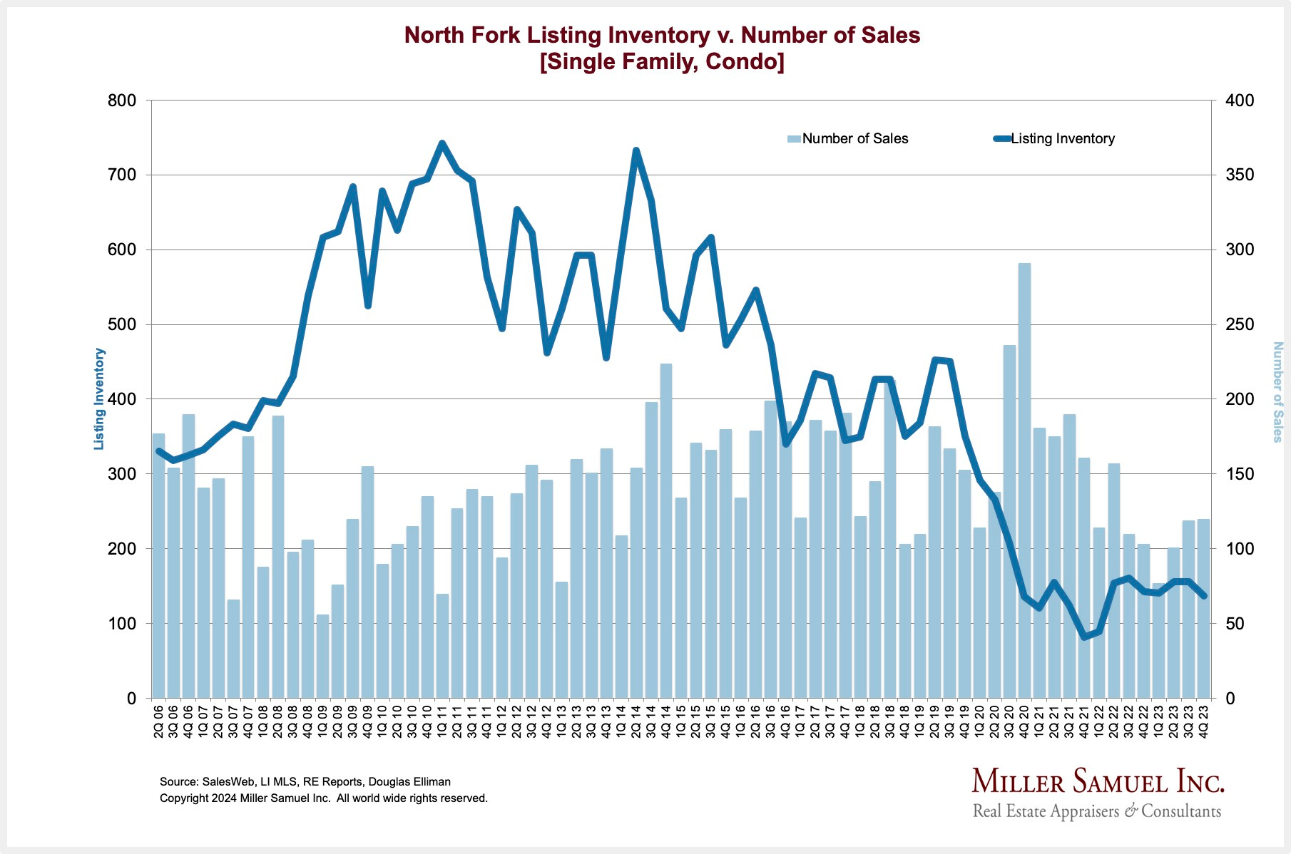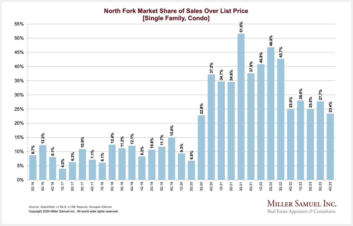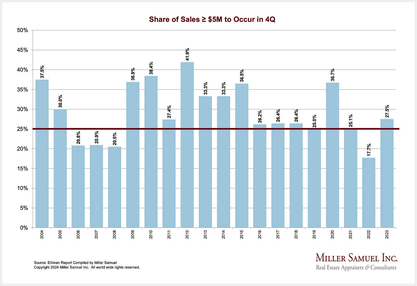 A few years after the financial crisis, I started to look at the fourth quarter of the high-end (>$5 million) Hamptons housing market in the context of the entire year. Except for three years that straddled the financial crisis from 2006-2008, the fourth quarter outperformed its 25% mathematical share allocation, except in 2022, when mortgage rates were escalating rapidly. I suspect the fourth quarter surges are due to more exposure to high taxes in the new year. Sales that would close in the subsequent first quarter were pulled earlier to close by the end of the tax year.