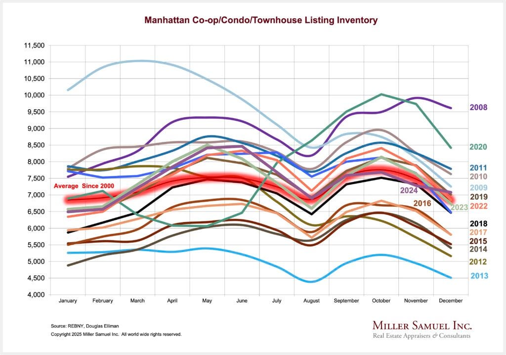 I’ve been manually tracking inventory for nearly 25 years and current levels are consistent with the long-term average. Many in the Manhattan brokerage industry have the sense that supply is tight. However, the empirical reality is that the pricing of inventory tends to be high, meaning that many of those listings are “on” the market but not “in” the market so supply feels constrained to agents trying to find properties for their customers.
