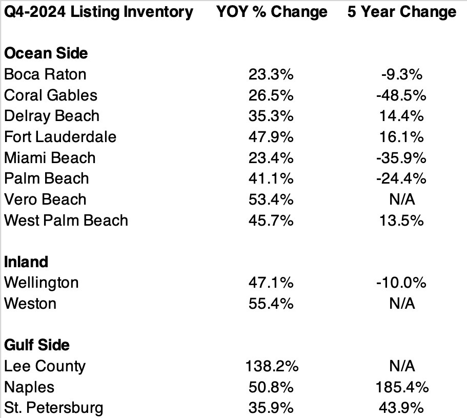 The year over year change in listing inventory is fairly consistent across Florida with a roughly 50% annually rise in supply no matter where the market is located. The key point here is that surge in supply is coming from record or near-record lows (Going from 1 to 2 is a 100% increase). However when the markets are broken out by regions, the gulf side appears to have a lot more inventory that has built up over the past five years while many of the ocean side listings remain below the levels of five years ago (pre-pandemic). I’d like to suggest that the last few years of Florida hurricane events have been concentrated on the gulf side.
