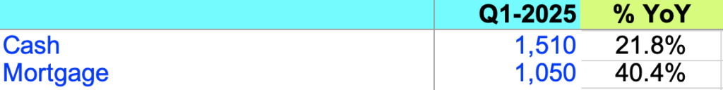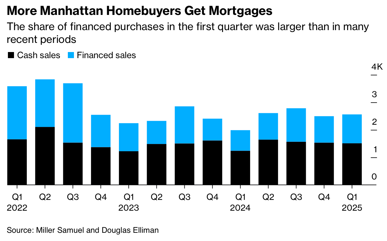 Here’s a snapshot from my internal spreadsheet that shows year over year sales gains for both cash and financed purchases. Even though Manhattan was a 58% cash market in Q1-2025, the growth of financed sales was double that of cash. The surge in cash buyers was driven by sharp losses in the financial markets as threats of tariffs dominated news feeds.