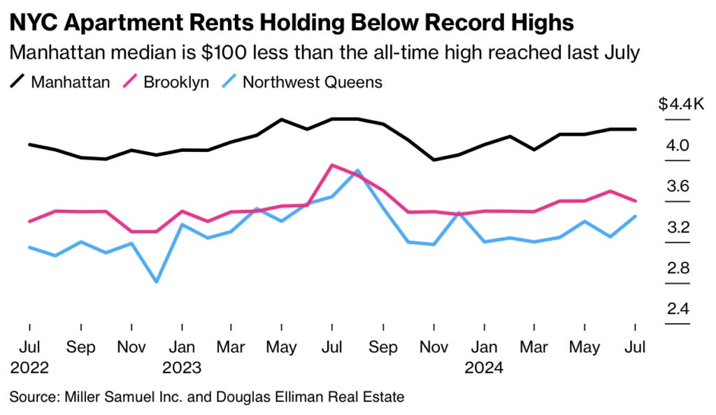 Beginning with the Manhattan rental research we pushed out today. Median rents appear to have peaked in July for the year, $100 shy of the year ago $4,400 record. This provides tenants no sense of relief with rents remaining quite elevated.
