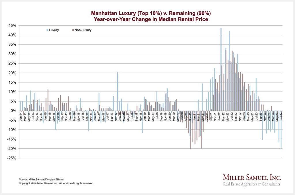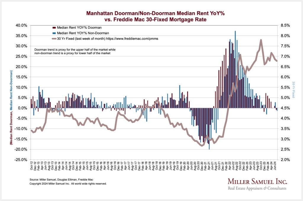 As mortgage rates fall, rents should begin to fall as would-be buyers who temporarily parked in the already crowded rental market and created the price surge are incrementally shifting back towards the purchase market, relieving some of the rental price pressure. We saw the bump in newly signed Manhattan contracts for July after a dismal spring.