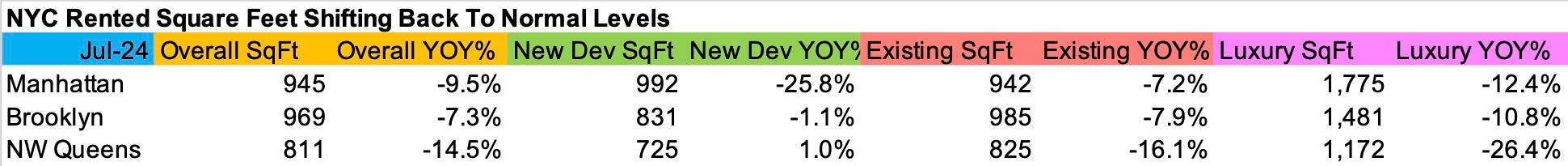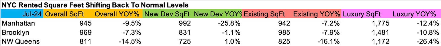 Renters are getting less space for their money…shrinkflation. I’m not talking about a 1-bedroom tenant moving to a studio or a 2-bedroom tenant moving to a 1-bedroom apartment. The average size of a rental apartment has been falling year over year for the past 11 months within each size category. They began to try their luck elsewhere, causing a surge in new lease signings. Here are some overall raw numbers from our July 2024 rental report.