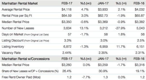 Manhattan – After reaching a record high of 30.9% in January, the market share of rentals with landlord concessions slipped to 26.4%, the second highest on record. The market share of landlord concessions was 19.1% in the same month last year, a record at that time. Landlord’s use of concessions has been effective in protecting the face rent by keeping the vacancy rate in check. The vacancy rate was 2.44%, up slightly from 2.31% in the same period last year…