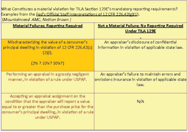 When the CFPB was asked what they meant by a “material failure” – the following table shows the difference between material and non-material. So how much is a material failure? A value off by 2%, 10% or 30%?