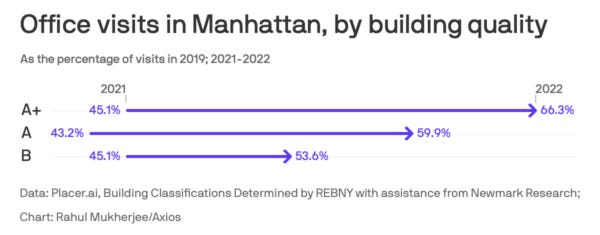 As I’ve mentioned, the upper end of Class A office space will likely see less damage than the remainder. This chart supports that idea from the Axios piece: When it comes to office buildings, it’s survival of the fanciest