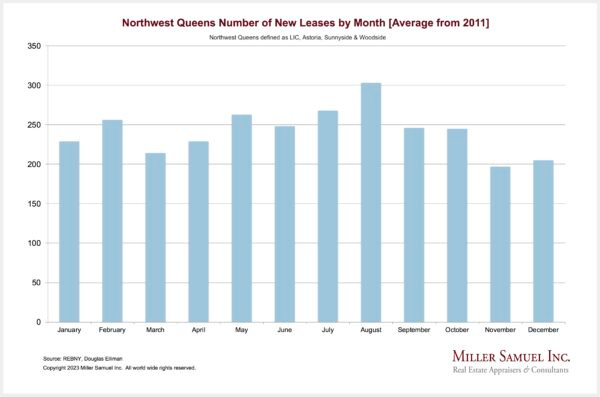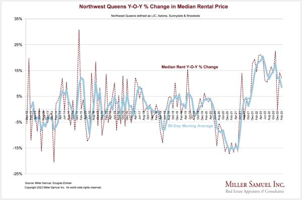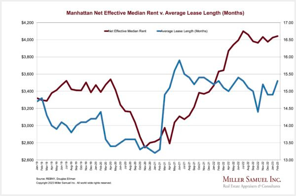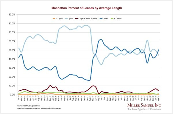 There was a broad expectation by tenants and media coverage that rents would fall once rents peaked last July. This was seen in the plunge in the market share of 2-year leases. Why lock in for a longer term when you think rents will fall? After October, tenants pivoted back to 2-year leases as it became clear that rents would not significantly decline. By this February, the market share of a 2-year lease returned to the 50% threshold as rents continued to flirt with the records set last summer. The market is moving closer to the spring and summer markets, typically the peak of pricing any given year. A similar pattern emerged in the other boroughs we report on as well.