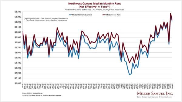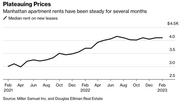 NYC rental market price levels have plateaued since peaking last summer, largely because of a strong economy and rising mortgage rates (pushing would-be buyers into rentals).