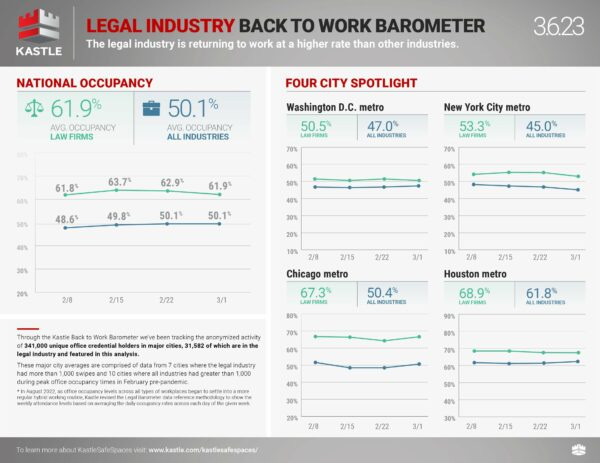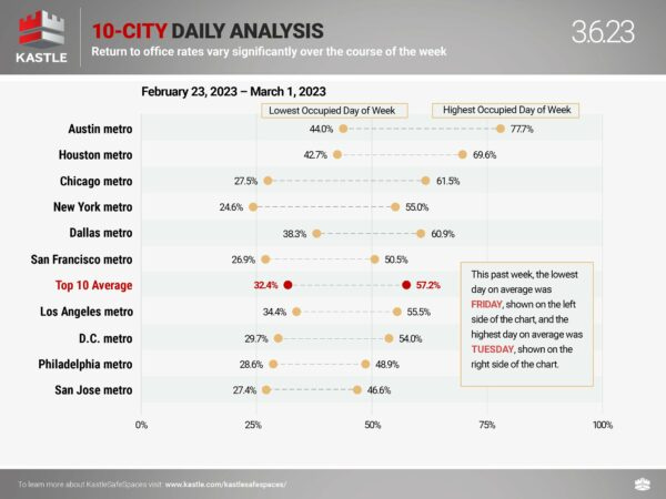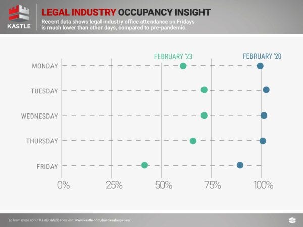 Here is the latest security card swipe data from Kastle – Remember that their charts indicate that pre-pandemic occupancy is 100% which is not what they really mean. I wish they’d fix that.