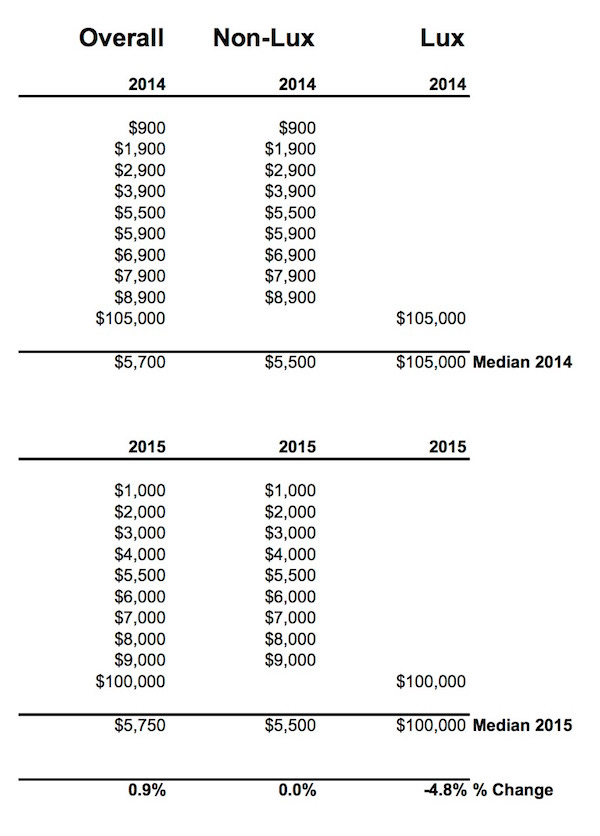 I created an example below of a situation where the overall % change is not in between the 2 parts. I am going to use this every time the question comes up. The % change results of the lux and non-lux markets do not “bracket” the overall % change at the bottom of the chart.