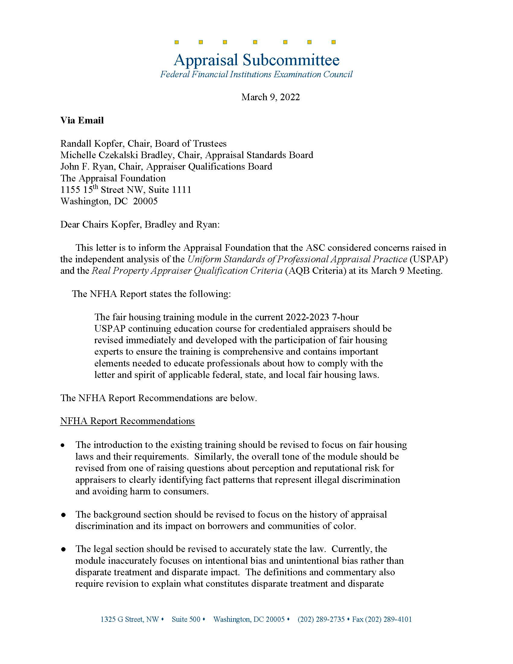 The ASC board asked TAF to explain what they are doing about their new 7-hour USPAP update course which NFHA said was harmful to appraisers.
