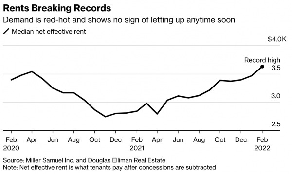 – Non-doorman rent jumped annually at a record rate for the second straight month for the fifth consecutive month of gains