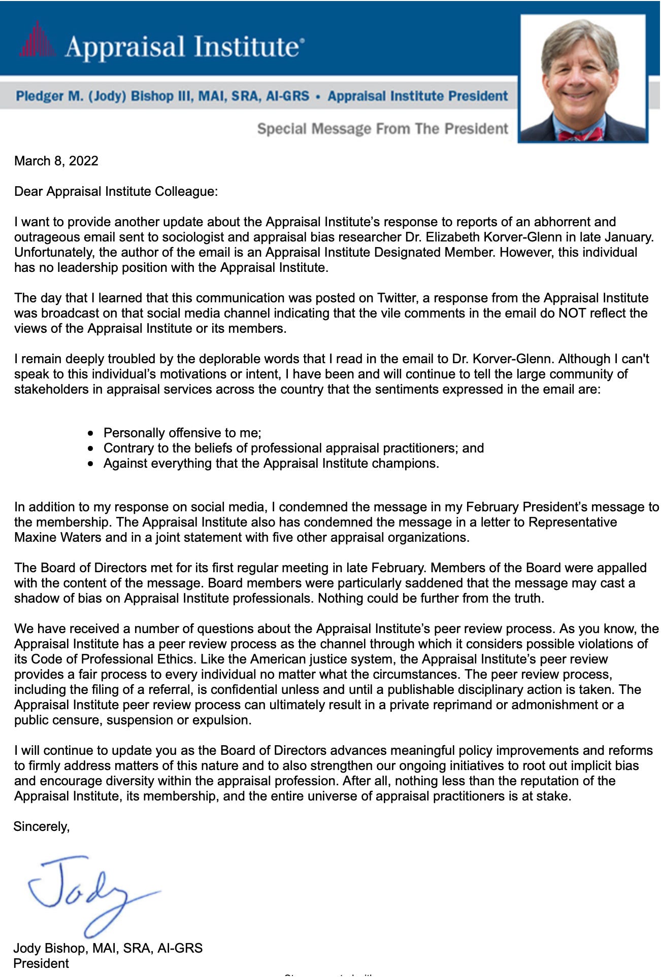 This individual’s views do not represent those of the Appraisal Institute. When we see stories about consumers who feel they were treated differently because of their race, it is troubling because that is not who we are as a profession, and bias has no place in appraisal.