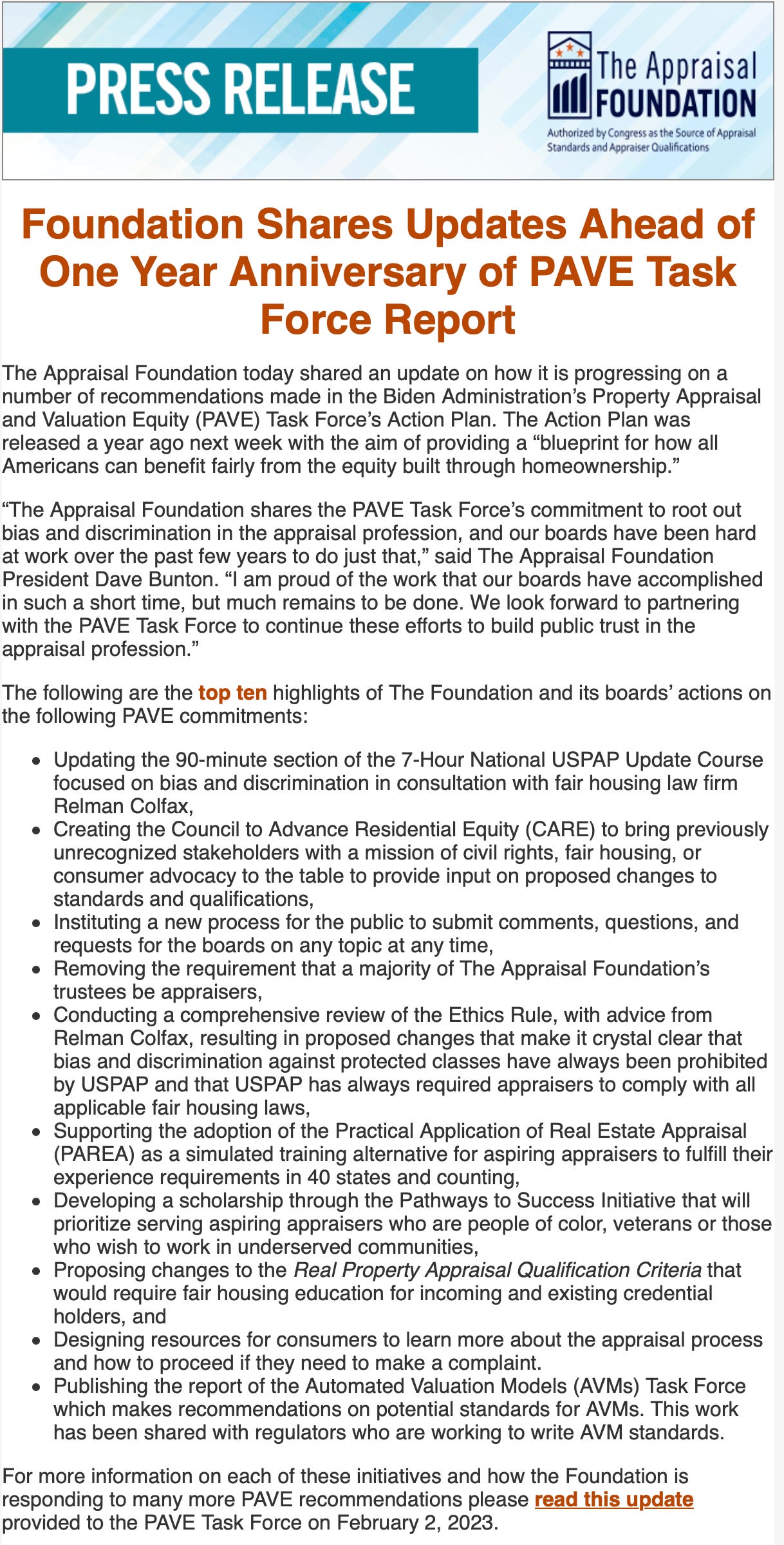 TAF is doing nothing in response other than creating a list of empty achievements since the release of the PAVE report from a year ago. Their CARE council, for example, is a complete waste of time and is well outside the scope of their mission. This laissez-fare attitude damages the public trust further and incentivizes or provides an opportunity, such as Fannie Mae and their obvious efforts to eliminate appraisers. #iloveappraisalwaivers