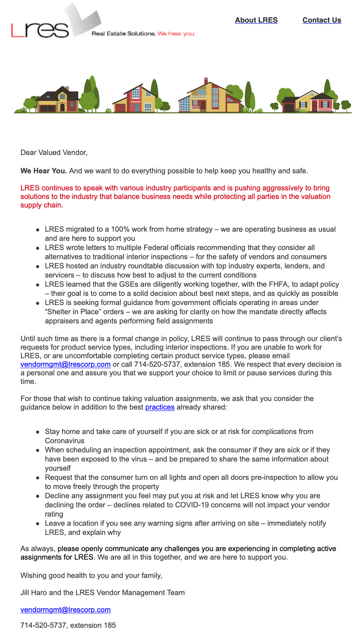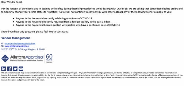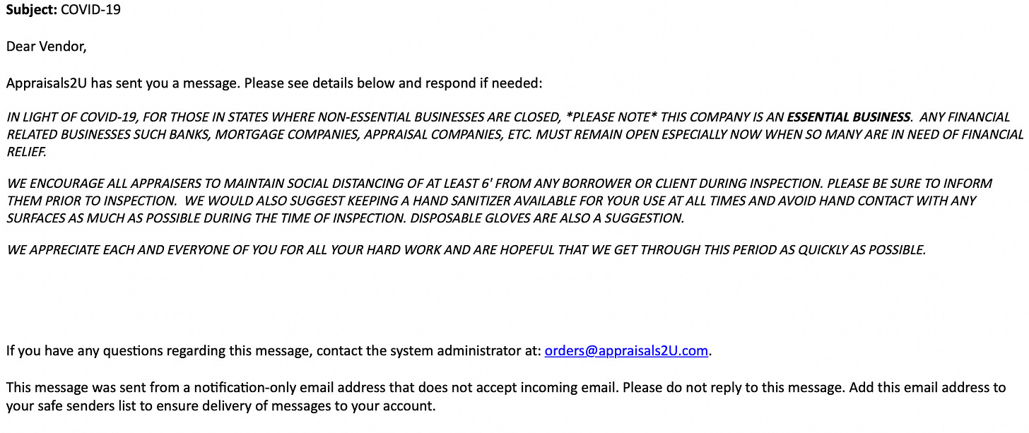 If you’ll note in this pattern of negligent behavior, great efforts were made to plan for the safety of order staff, but no regard for the safety of the appraiser, who is providing the service – telling appraisers to wash their hands and practice social-distancing when they know that it is not enough. When you get right down to it, these companies sent similar silly instructions so they can check off a box to be compliant. Yet they must know that appraisers could be carriers, and occupants in the property could be carriers. This is not business as usual.