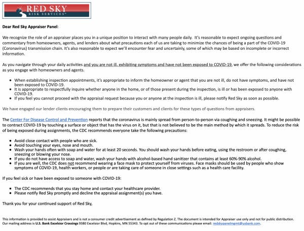 And a few more notices that basically told appraisers to wash their hands when it is already known that a solution like that doesn’t protect the appraiser or the property occupant.