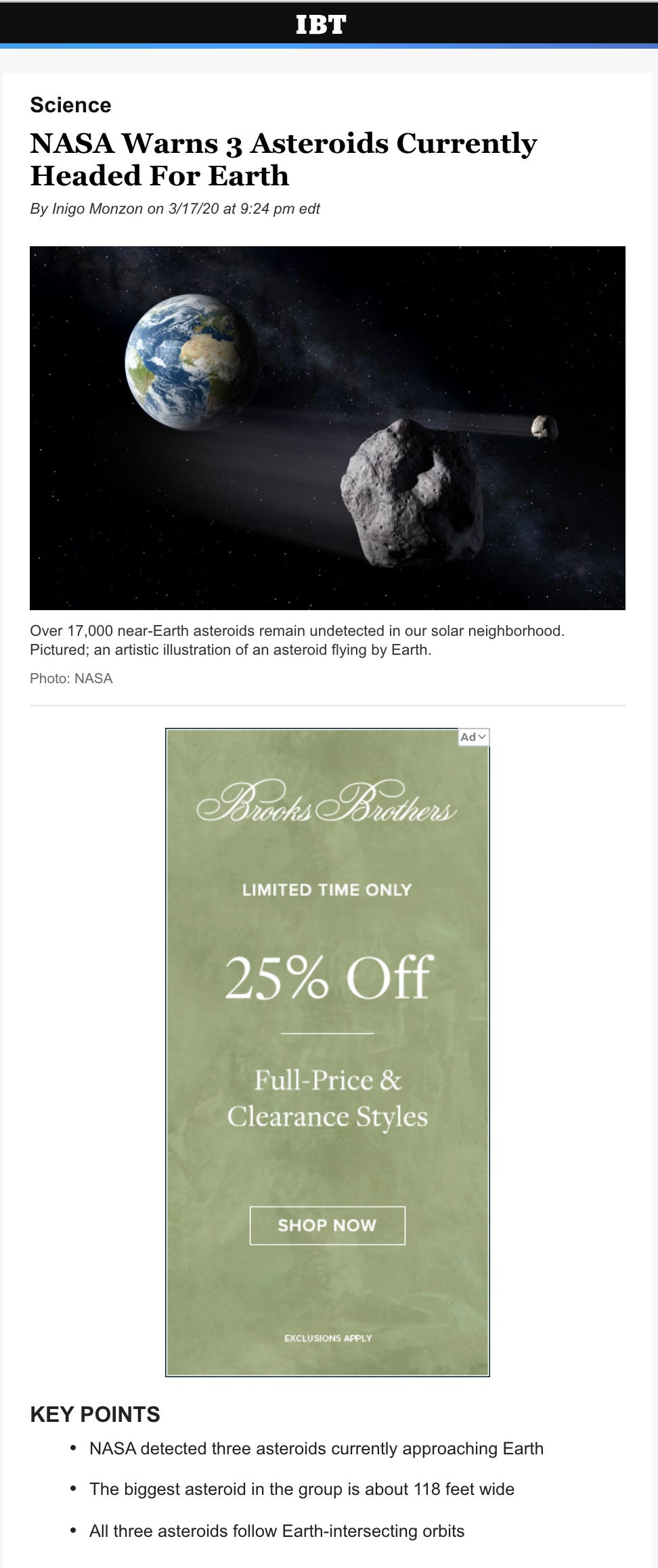 A few days ago, NASA reported that 3 asteroids could hit earth last Wednesday, and I thought to myself, what else could go wrong in my life right now? We are in the early stages of an economic meltdown, with massive layoffs expected and continued uncertainty with testing and the rate of growth of the coronavirus.