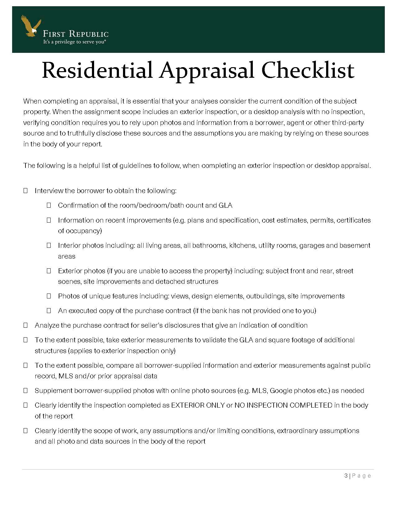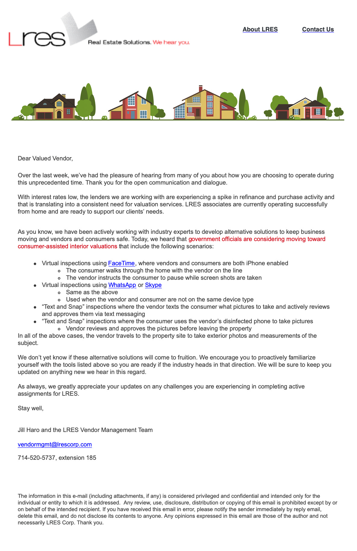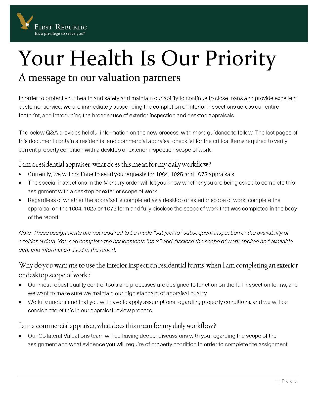 I submitted a temporary driveby appraisal solution to First Republic Bank, a large CA/NYC+ lender we have worked with since 1999. I feared for the safety of our appraisal staff and didn’t want to risk infecting others. Plus we were starting to get pushback from homeowners who were getting uncomfortable. They embedded this solution within days. I challenge any appraiser to name any other bank that is more professional, more appraiser-centric than they are. Here is the note they sent out to their panel.