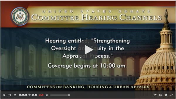 The Senate Banking Committee held a “Strengthening Oversight and Equity in the Appraisal Process” public hearing on Thursday with Melody Taylor and James Park as witnesses. You can watch it here: