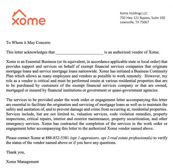 XOME Issues Vendor Authorization Letter In Case Appraisers Get Arrested