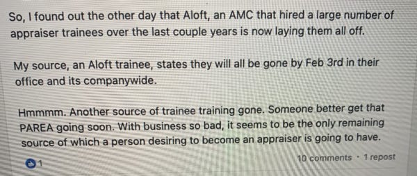 Earlier this month, I saw this bulletin board post, and an error caught my attention…because Aloft is not an AMC. It’s a national appraisal company. I had assumed the same thing last fall when I was critical of them in these Housing Notes, and I ended up removing the post and apologizing in the interest of full transparency. Hey, I’m human (I think).
