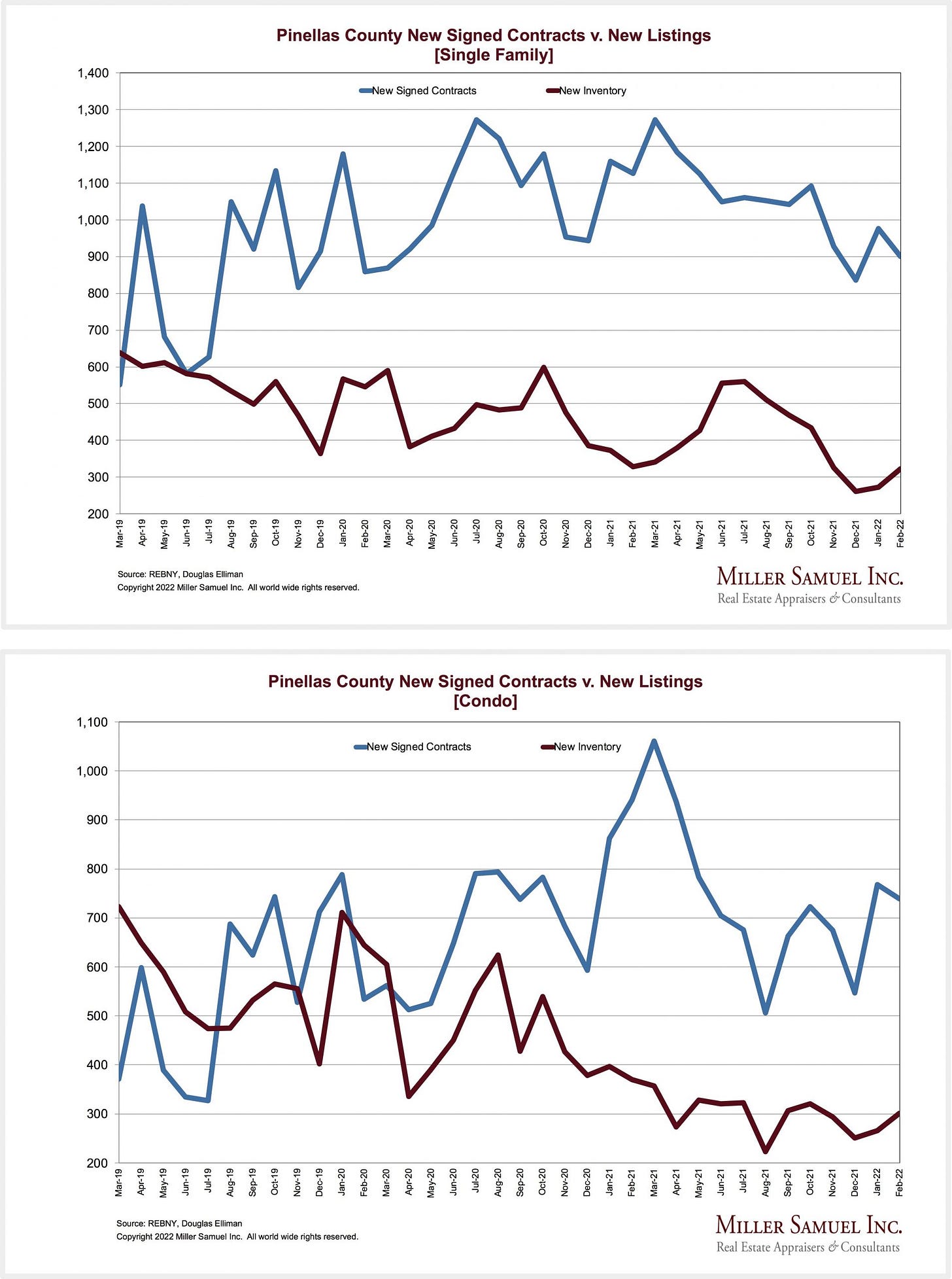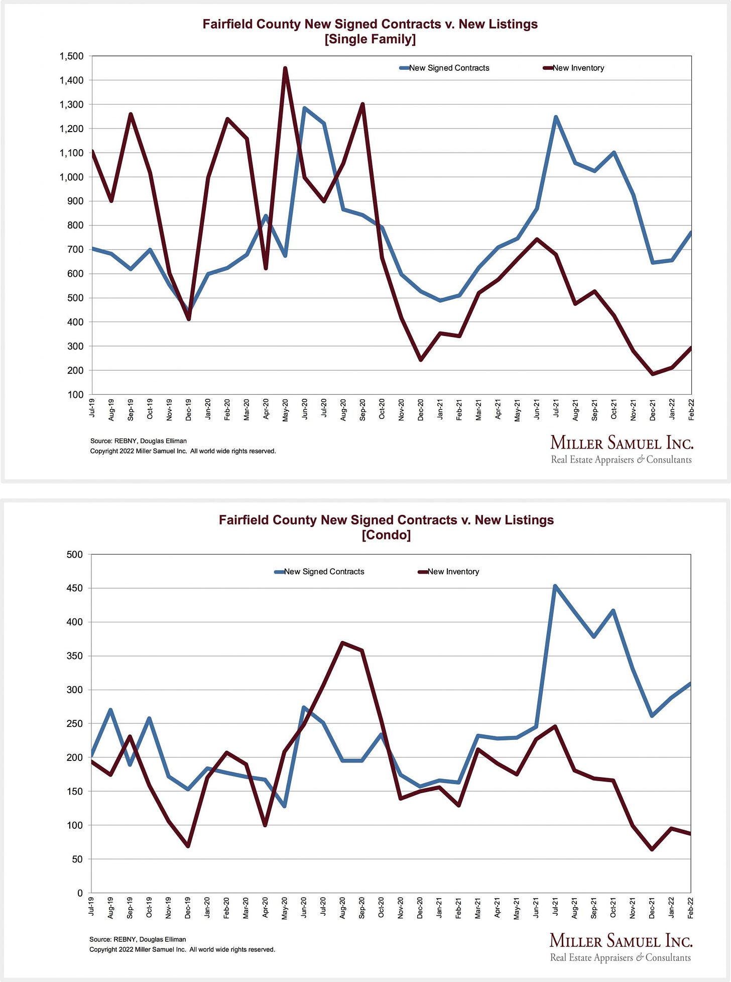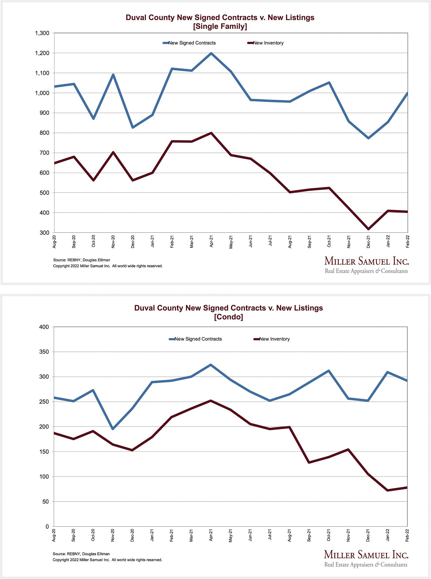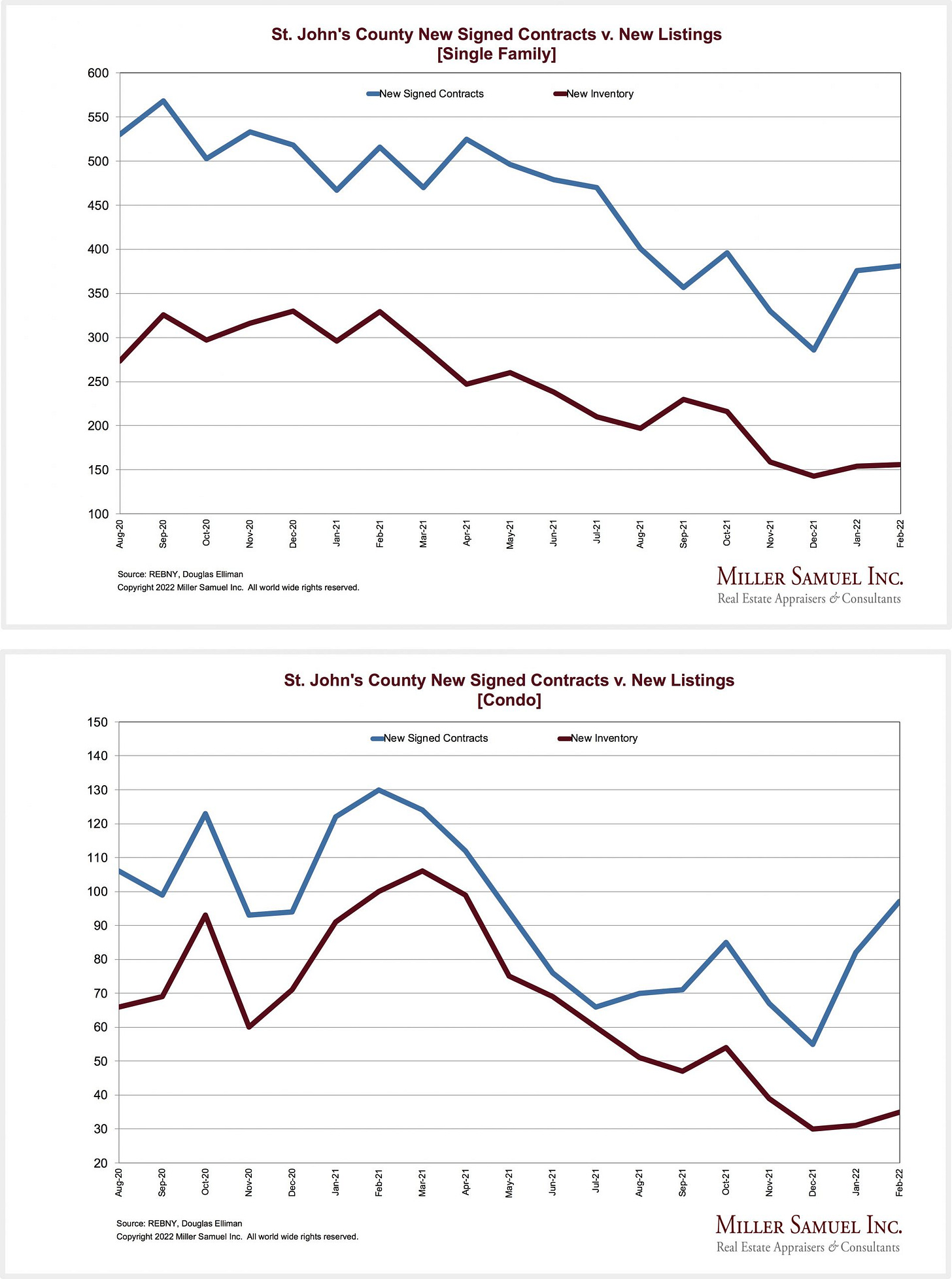 Both new listings and newly signed contracts for both property types have fallen over the past nine months showing that supply cannot meet demand. Overall, newly signed contracts remained below pre-pandemic levels as supply continued to collapse.