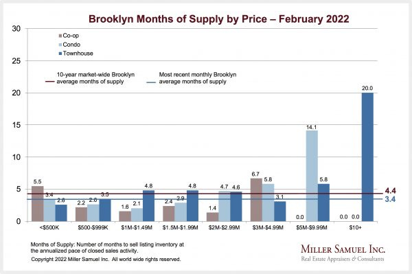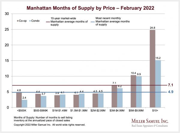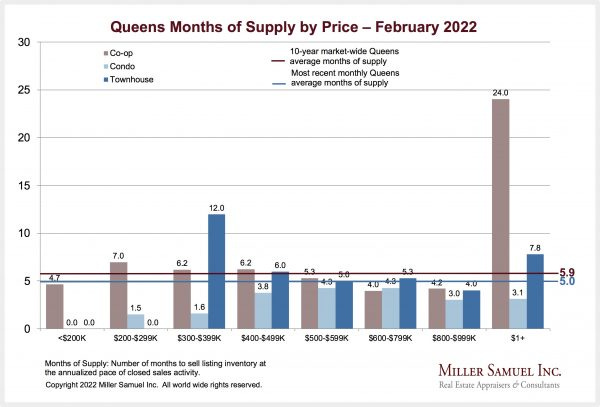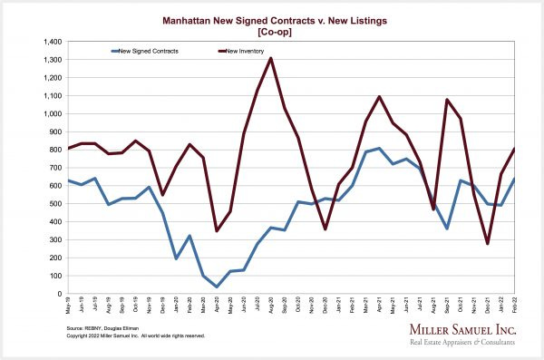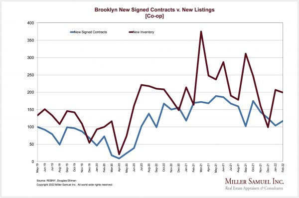 Co-ops and 1-3 family new signed contracts are rough double pre-pandemic levels, and condos are up sharply over the same period. On an annual basis, co-op sales are the only property type above the same period last year.