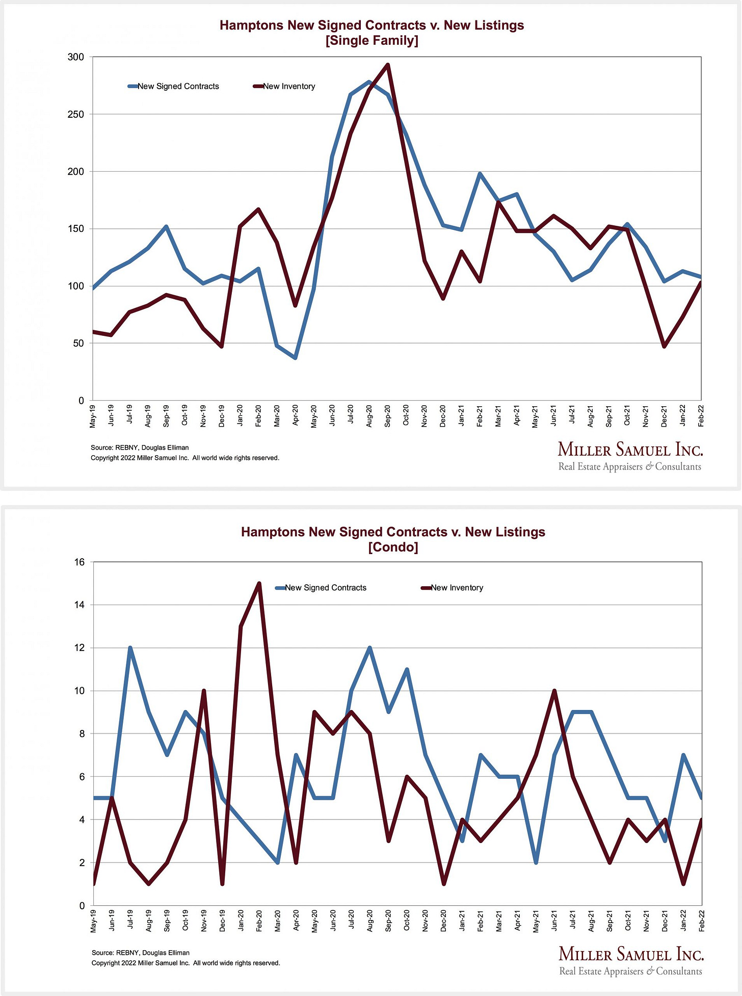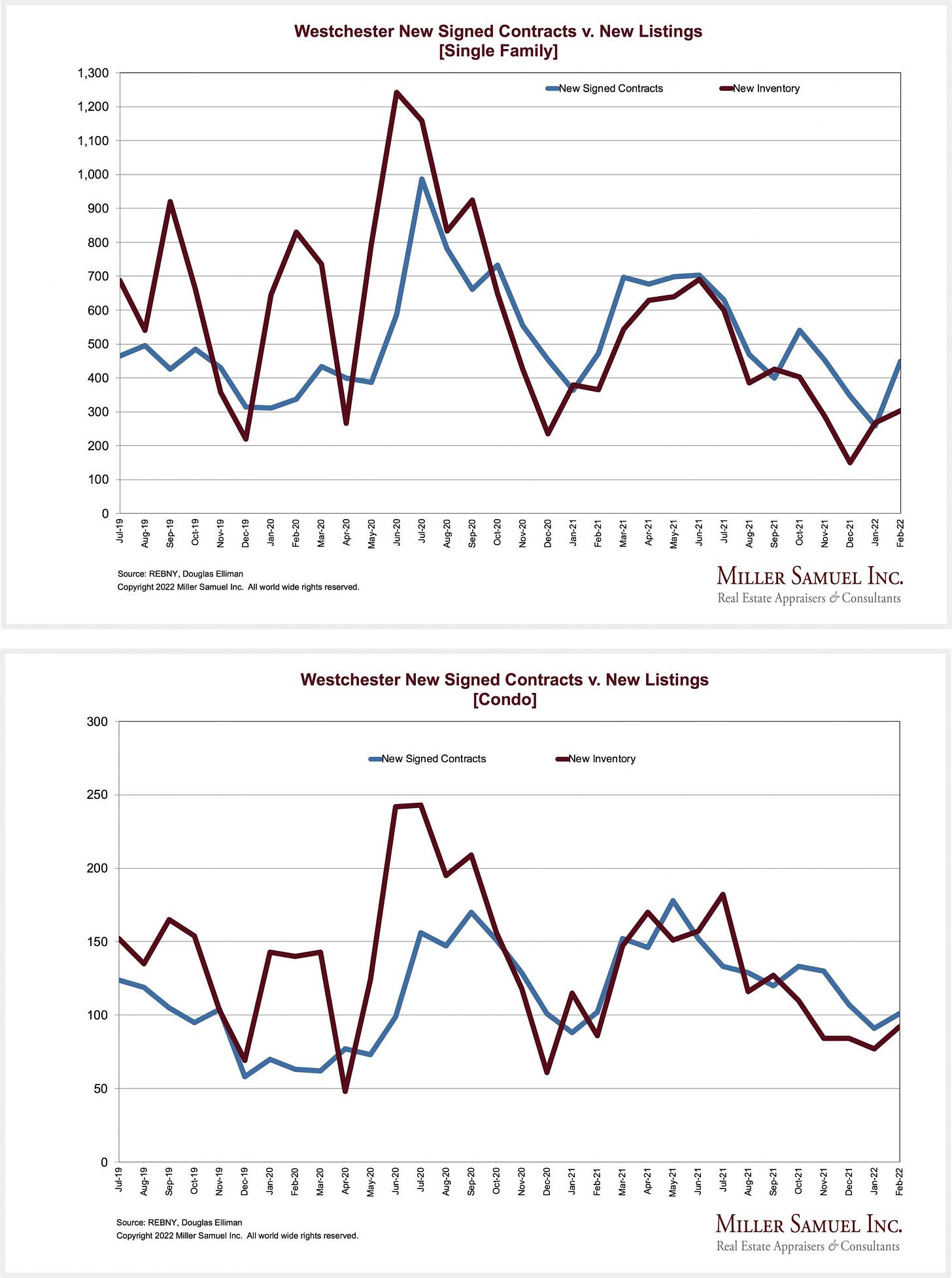 Both new listings and newly signed contracts for both property types have continued to fall year over year since last spring. However, newly signed contracts have been higher than pre-pandemic levels since September.