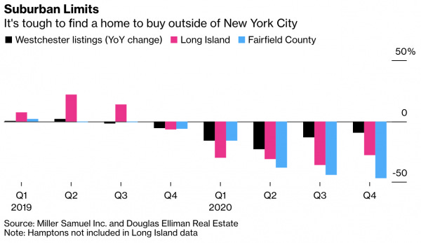 The New York Times and Bloomberg News looked at the collapse of listing inventory in the suburban markets that surround New York City.