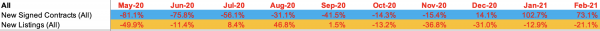 New inventory for single family and condos combined fell year over year by the largest amount since April when tracking began. The new year has seen two straight months with year over year gains in the combination of single family and condo new signed contracts. The month of February saw the second-largest annual increase in new signed contracts since this report series began last April, with January seeing a slightly larger gain.
