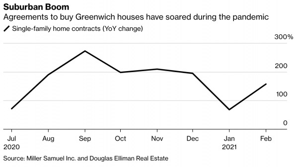 Those with a taste for the ultra-luxury have turned their attention to Greenwich’s older estates outside the town center, which had fallen out of favor in recent years. Two homes listed at $20 million or more found buyers last month, compared with none in February 2020.