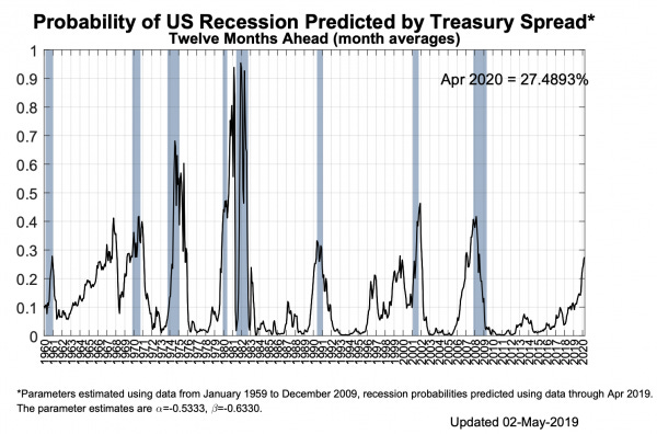NY Fed: The probability of U.S. Recession as predicted by Treasury Spread was 27.5% in April.