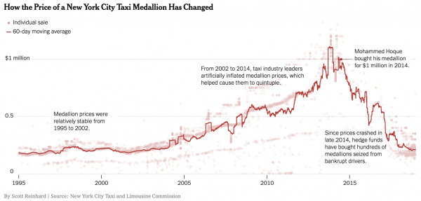 There was a spectacular yet very sad investigative piece in the New York Times on the disastrous situation in the taxi industry. I’ve always been fascinated with the valuation of taxi medallions that enable owners of yellow cabs to prowl the streets of New York looking for a fare. I made the assumption, as did most, I suppose, that the collapse of the taxicab medallion value was due to the massive influx of rideshare services like Uber and Lyft. But as we learned from the housing boom and bust, it was a credit bubble with housing as a symptom that enabled the collapse. For the taxi industry, it was yet another case of predatory lending and a house of cards – the rideshare phenomenon simply accelerated the collapse. And like the Uber and Lyft IPOs have shown us, the drivers are left behind.