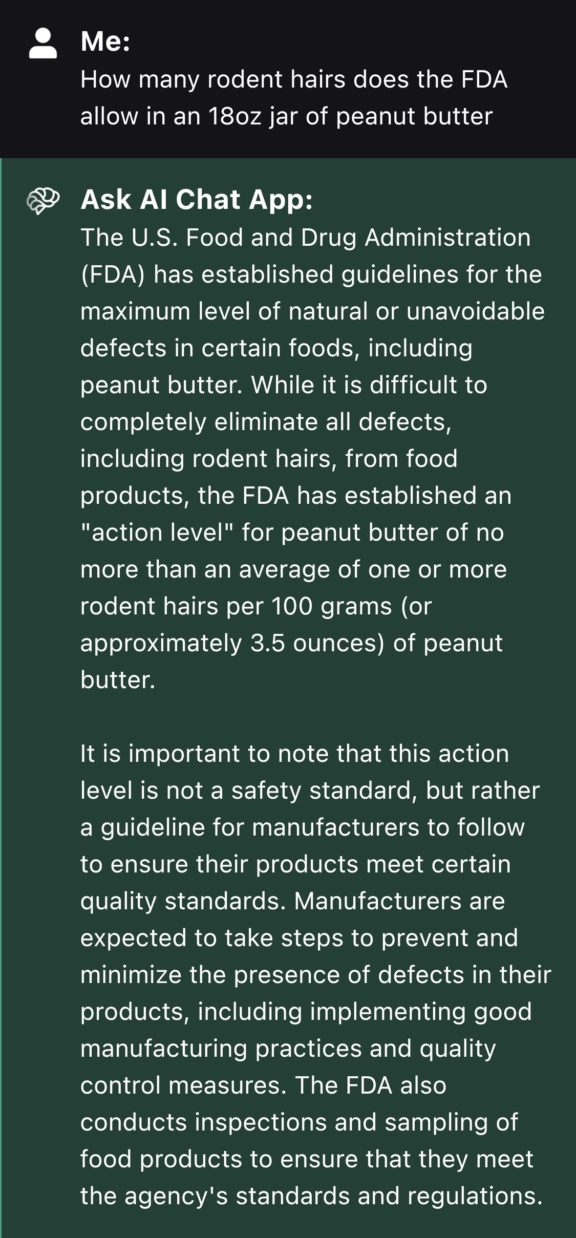 In my last college course, on the last day of class for my last class of the day, I gave a speech about awful stuff in your food. I remember something about the number of rodent hairs the FDA allows in peanut butter (I love peanut butter). So I asked ChatGPT the following (since we know everything in regenerative AI is true, just like the internet):